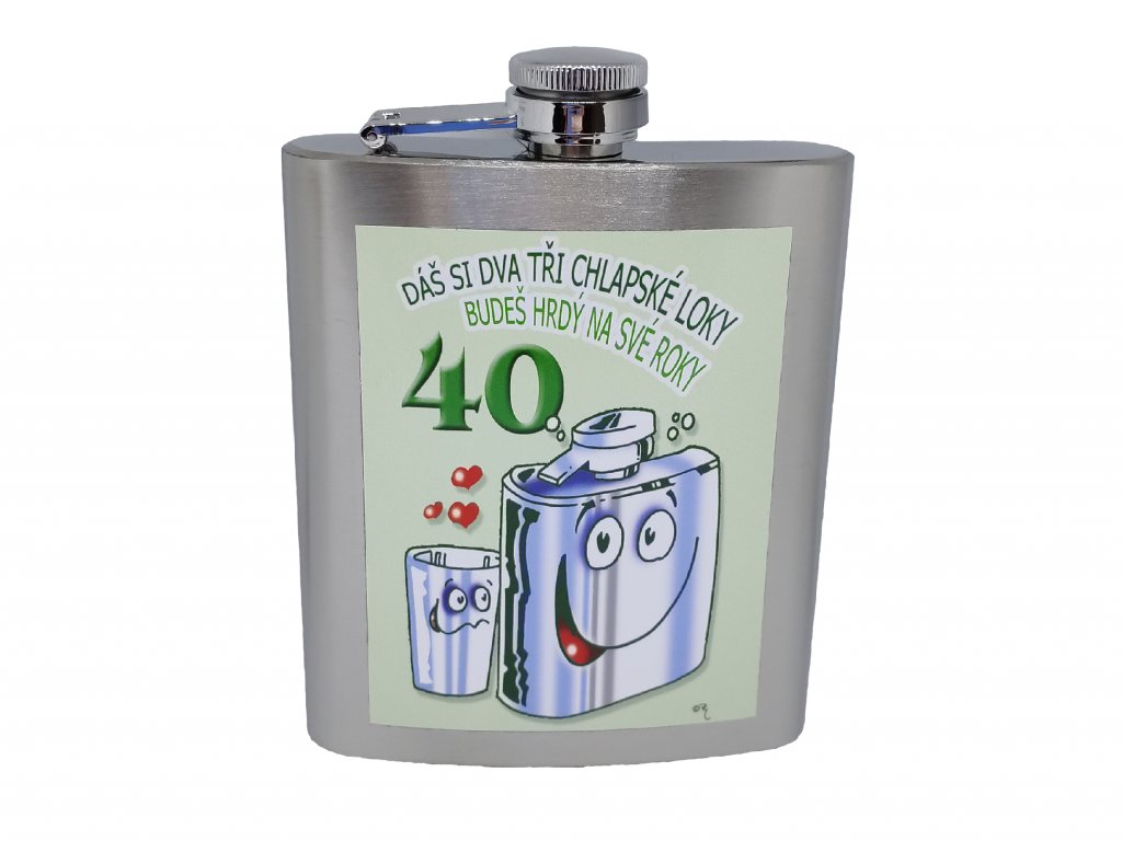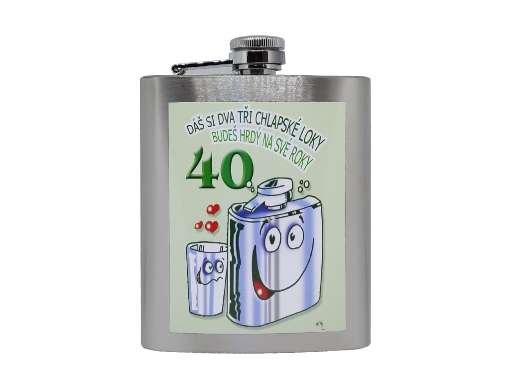 Váš partner alebo kamarát oslavuje narodeniny a hľadáte pre neho najvhodnejší darček k jeho 40tinám? Už nehľadajte a kúpte mu túto prvotriednu ploskačku. Ploskačka - Dáš si dva tri chlapské glgy 40, povzbudí humorným nápisom a zachráni Vás v prípade, keď potrebujete dodať šťavu. Ploskačku môžete mať stále po ruke a nosiť v nej uschovaný Váš obľúbený alkoholický nápoj. Užívajte si života až do dna s touto netradičnou humornou placatkou pre pánov. Ploskačka - Dáš si dva tri chlapské glgy 40 , je originálny darček pre partnera alebo kamaráta .