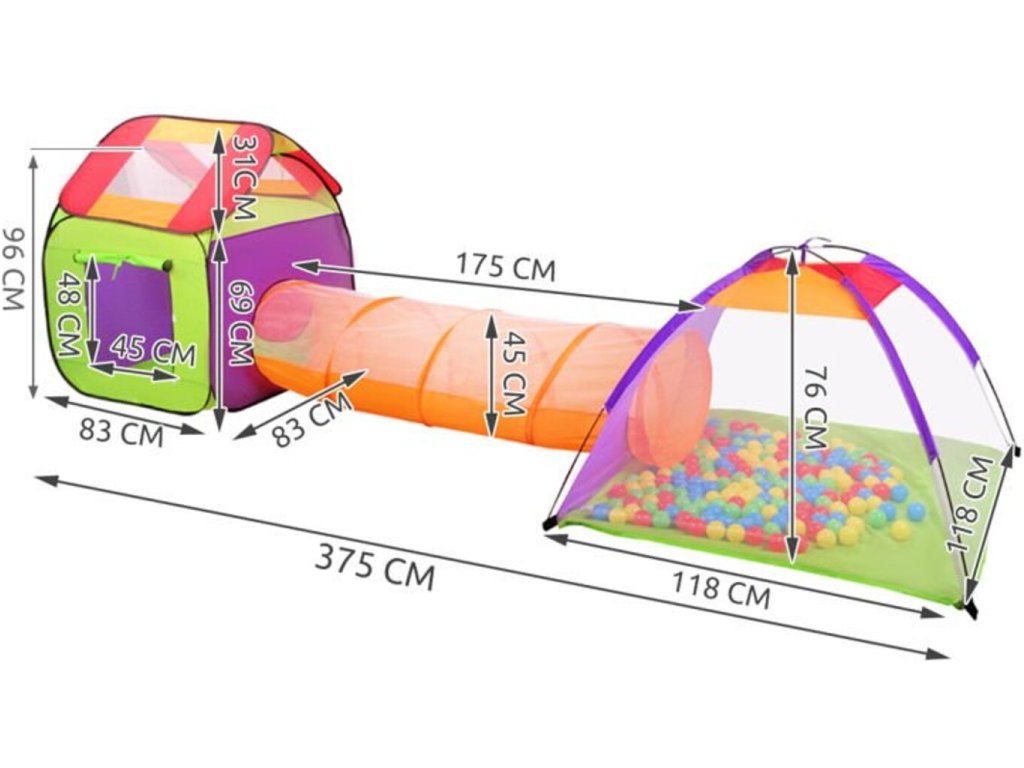 Detská zábava nebude mať s týmto setom farebných stanov hraníc. Stanovanie, lezenie tunelom a hra s loptičkami osloví každé dieťa. Stanový set pozostáva z troch samostatných častí, ktoré sa dajú využívať spoločne i zvlášť. Vaše deti sa môžu zabávať v domčeku, v stane alebo v tuneli. Súčasťou setu je aj 200 farebných loptičiek, ktoré všetky deti milujú. Stanový set je možné použiť doma i v záhrade. Je vyrobený z pevného, priedušného materiálu.