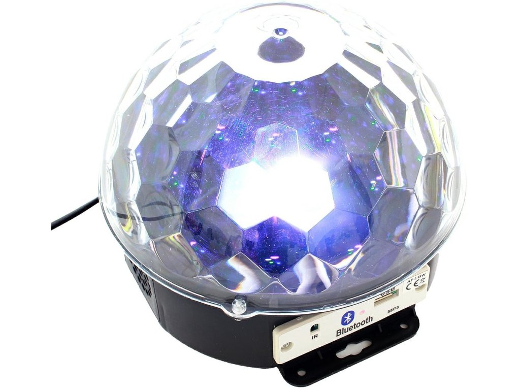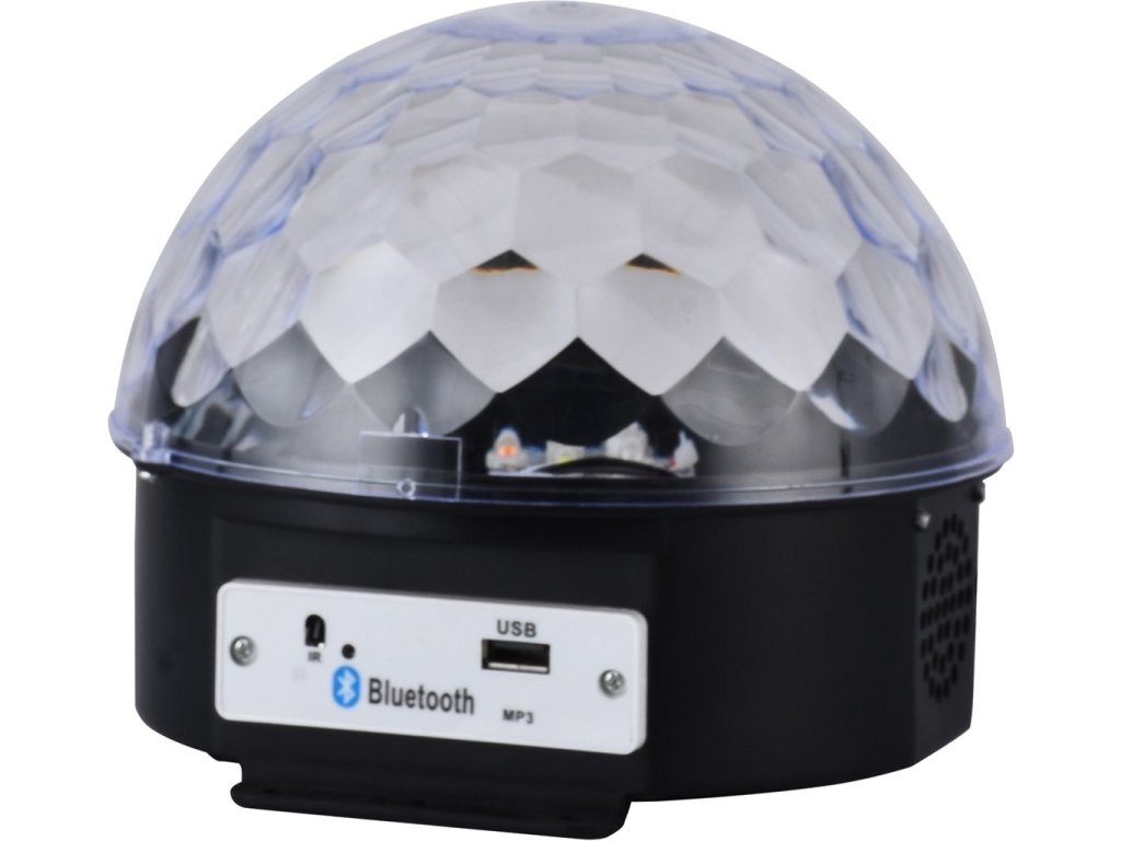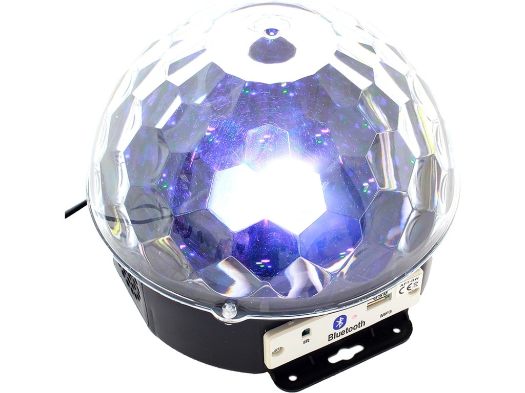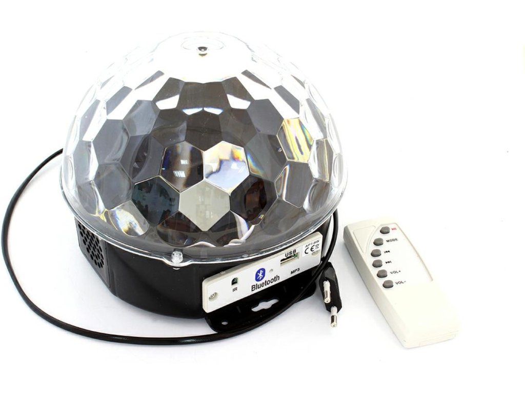Disco LED guľa MP3 BLUETOOTH so vstavaným MP3 prehrávačom, USB portom a vysoko kvalitnými stereofónnymi reproduktormi. Zariadenie je ovládané diaľkovým ovládačom alebo spárovaným zariadením vybaveným modulom Bluetooth. Disco LED guľa MP3 BLUETOOTH je vybavená až 6 výkonnými LED diódami rôznych farieb (červená, biela, žltá, fialová, zelená a modrá). Skvelé svetelné efekty poskytuje vstavaný motor, ktorý otáča LED diódy, ako aj riadiaci systém a zvukový senzor, ktorý umožňuje LED blikať do rytmu hudby! Zariadenie môže tiež svietiť a zobrazovať vzory bez prehrávania zvuku - možno ich zmeniť stlačením tlačidla.