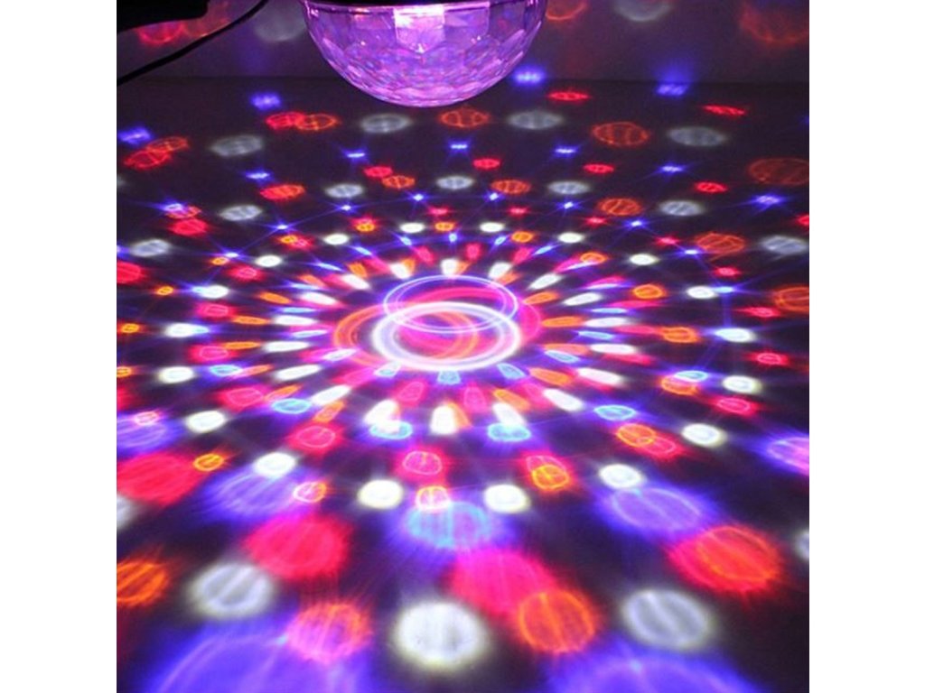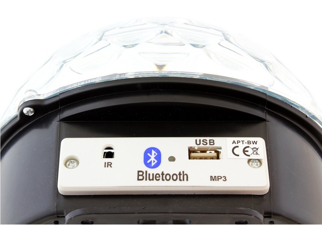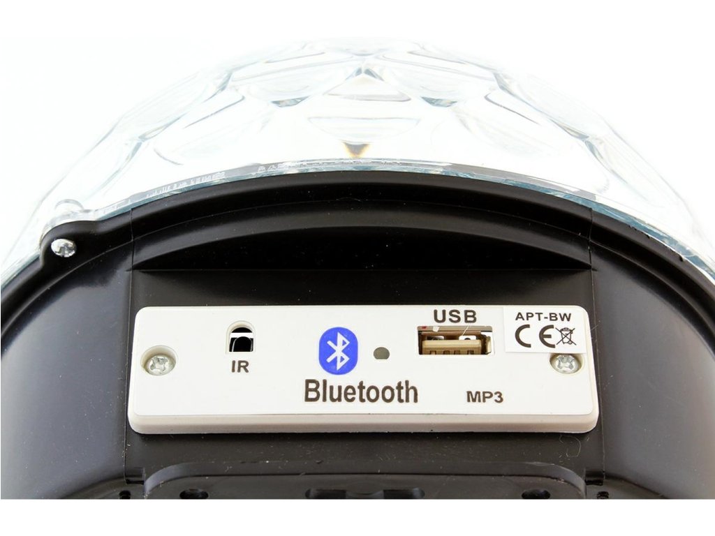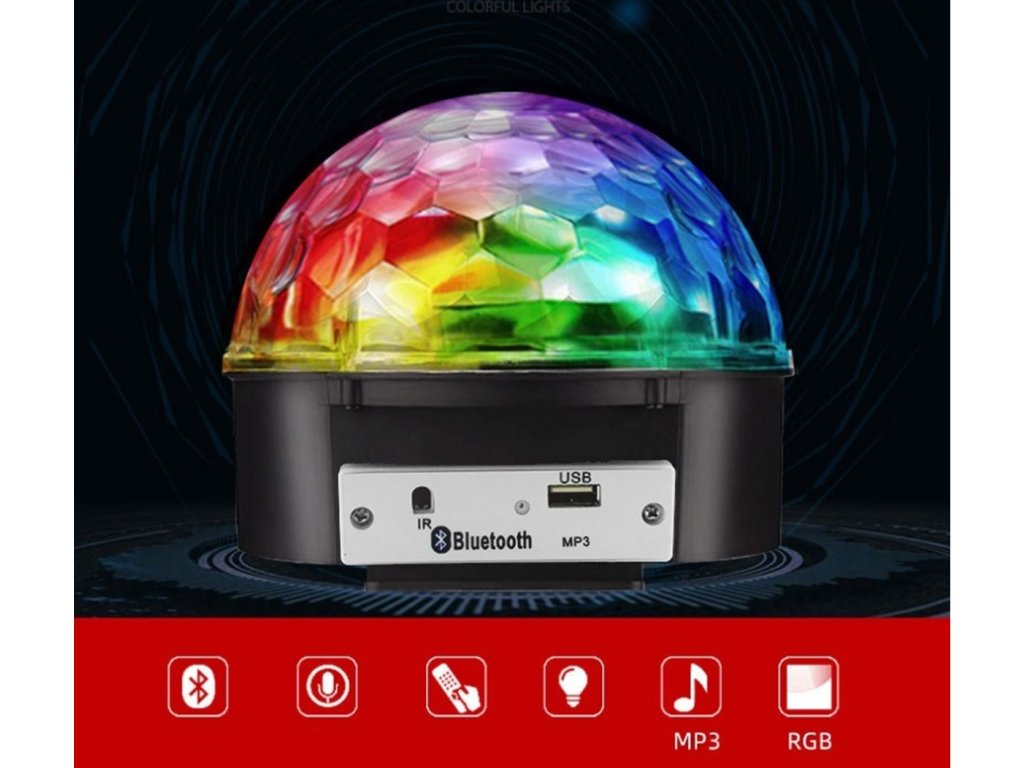 Disco LED guľa MP3 BLUETOOTH so vstavaným MP3 prehrávačom, USB portom a vysoko kvalitnými stereofónnymi reproduktormi. Zariadenie je ovládané diaľkovým ovládačom alebo spárovaným zariadením vybaveným modulom Bluetooth. Disco LED guľa MP3 BLUETOOTH je vybavená až 6 výkonnými LED diódami rôznych farieb (červená, biela, žltá, fialová, zelená a modrá). Skvelé svetelné efekty poskytuje vstavaný motor, ktorý otáča LED diódy, ako aj riadiaci systém a zvukový senzor, ktorý umožňuje LED blikať do rytmu hudby! Zariadenie môže tiež svietiť a zobrazovať vzory bez prehrávania zvuku - možno ich zmeniť stlačením tlačidla.