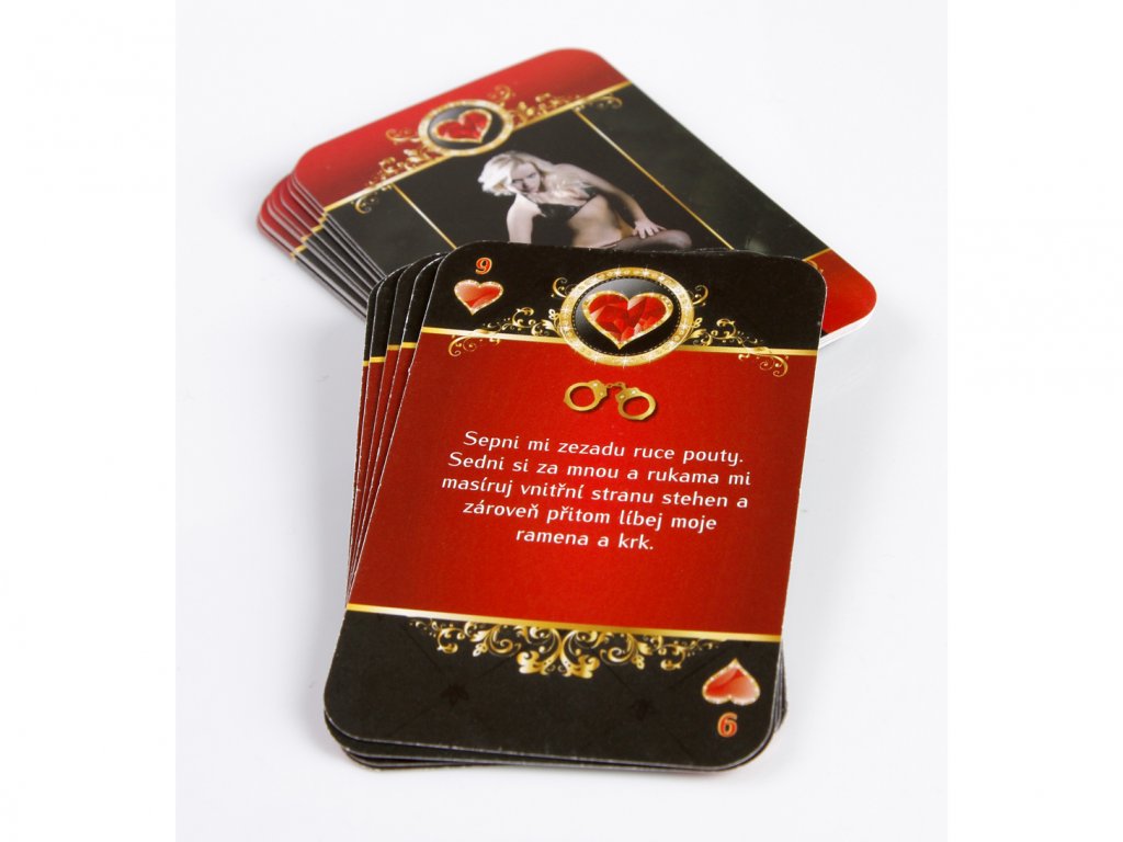 Hrací plán, plyšové putá, balíček kariet, pštrosie pierko, zápalky a vonnú sviečku.