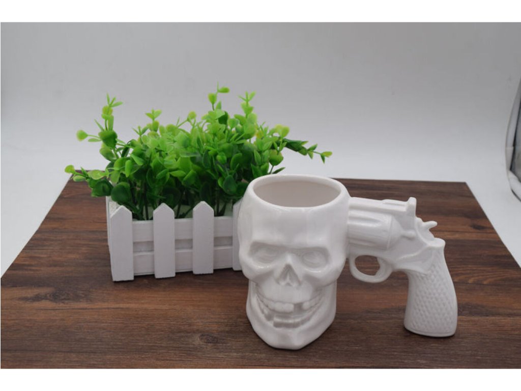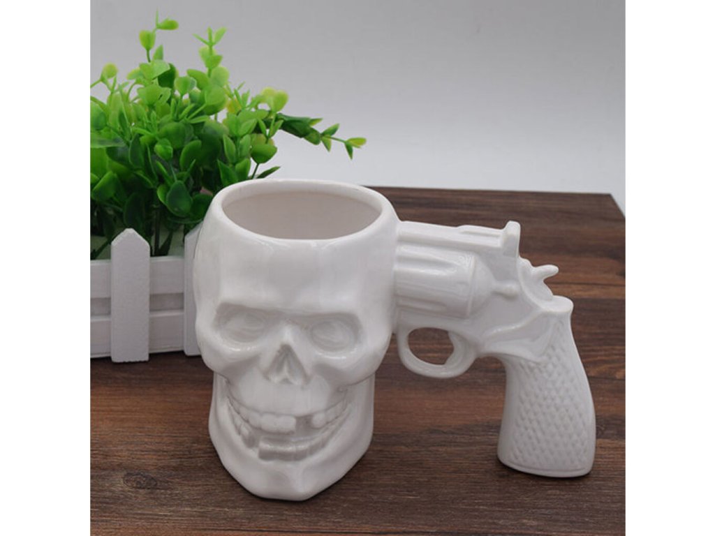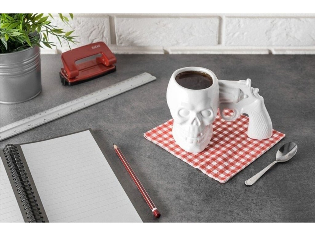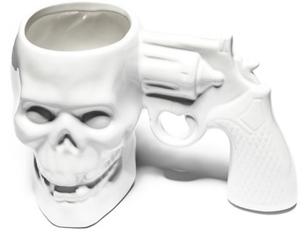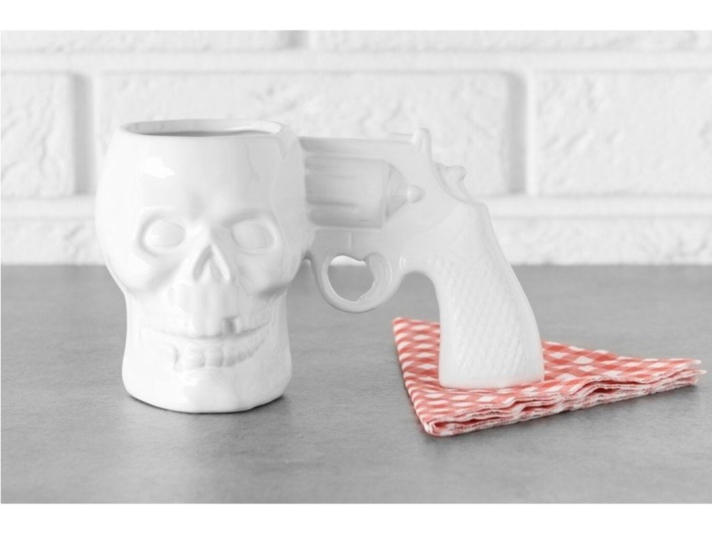 Predstavujeme vám originálny hrnček pre všetkých drsných chlapov, milovníkov ostrých zbraní a detektívok. Hrnček v tvare štrbavej lebky so zbraňou priloženou k spánku iste pobaví i poteší. Káva servírovaná v tomto jedinečnom hrnčeku získa ostrú príchuť dobrodružstva a adrenalínu. Darujte tento neprehliadnuteľný hrnček a pripravte svojim blízkym nezabudnuteľné okamihy pri rannej káve či inom obľúbenom nápoji ostrých chlapov.