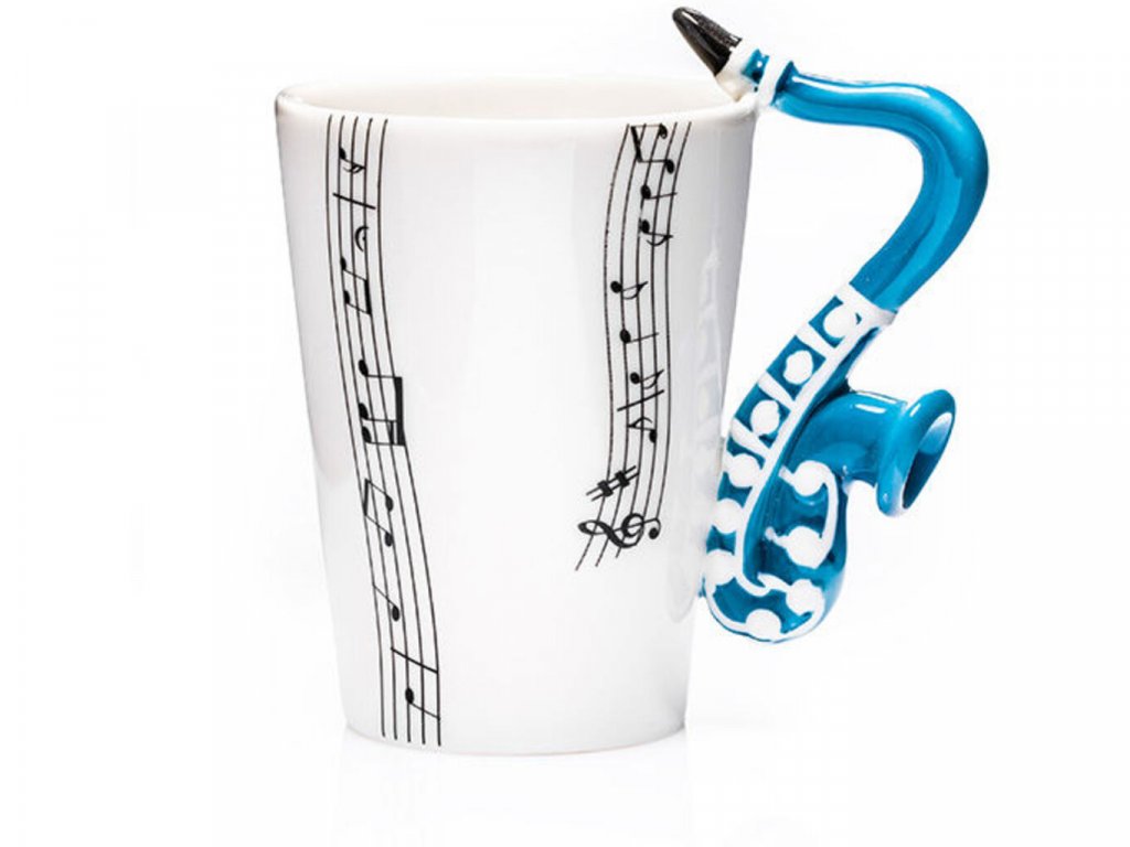 Hrá vo vašom okolí niekto na saxofón? V tom prípade máme pre vás inšpiráciu na skvelý darček. Pre každého milovníka hudby je tu tento originálny porcelánový hrnček s modrým uškom v tvare saxofónu a s čiernou notovou potlačou. Rána pri šálke kávy teraz získajú novú, hravú príchuť a každý dúšok bude inšpiratívny ako melodická hudba. Hrnček saxofón ocení ako originálny darček každý milovník skvelej hudby a lahodnej kávy alebo iného horúceho nápoja.