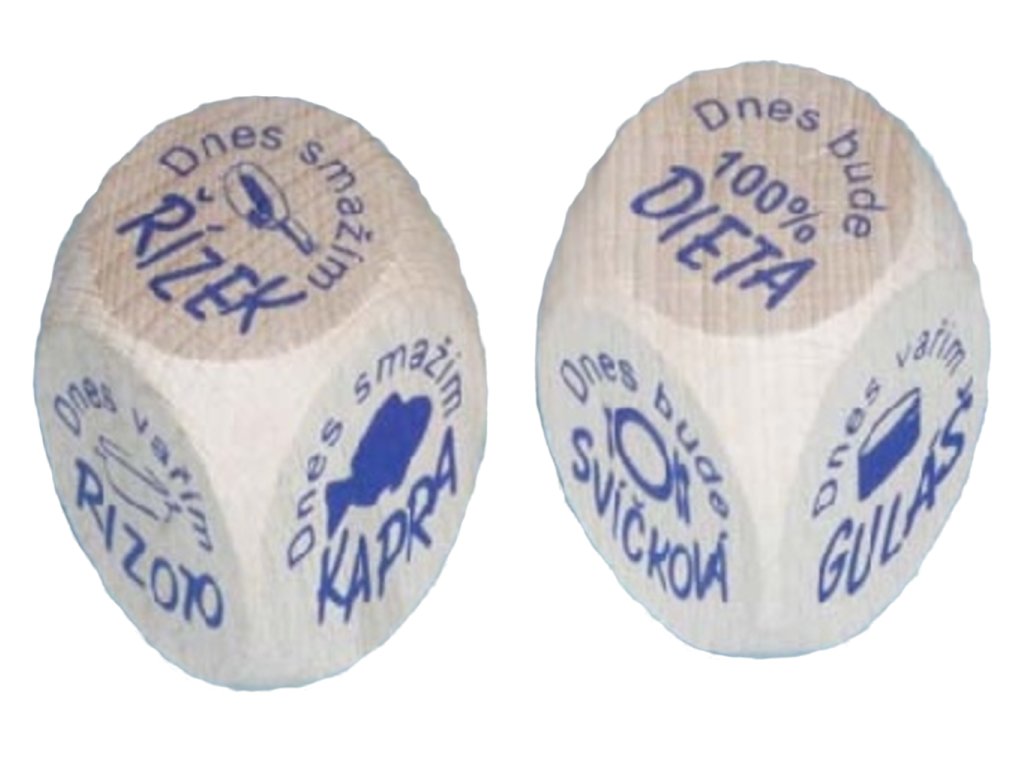 Trápi vás manželka alebo priateľka denne otázkou, čo by ste chceli na večeru? Alebo si sama neustále láme hlavu nad vymýšľaním obedového menu? Vyriešte jej problém raz a navždy. Darujte jej túto originálnu kocku, ktorá na každej strane ukrýva iné jedlo. Hoďte si a navarte napríklad rizoto, guľáš alebo si vypražte rezeň. Pozor, hrozí vám aj 100% diéta. Inak povedané manželka má z kuchyne voľno a vy budete musieť vydržať jednodňovú hladovku. Kocka - jedlo predstavuje skvelý darček pre každú domácu gazdinku.