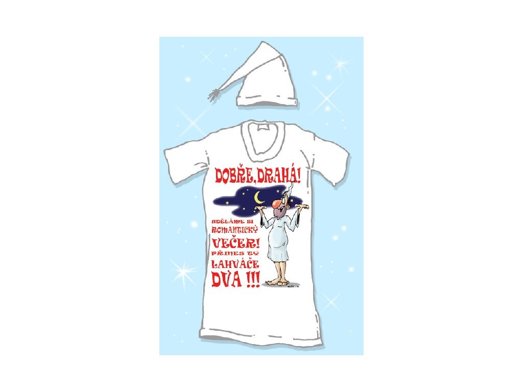 Premýšľate, čo zaobstaráte svojmu partnerovi za darček? Už nehľadajte, táto originálna a štýlová nočná košeľa s čiapkou je tým najlepším darčekom pre mužov so zmyslom pre humor. Nočná košeľa - Dobre drahá, urobíme si .. je príjemná a pohodlná, vyrobená z bavlny s vtipným obrázkom a nápisom. Touto košeľou svojej žene jasne poviete, čo chcete. Potešte svojho partnera alebo kamaráta s touto humornou nočnou košeľou pre pánov. Nočná košeľa - Dobre drahá, urobíme si .. je originálny darček k narodeninám.