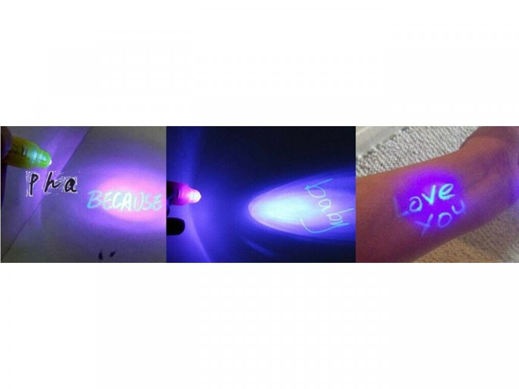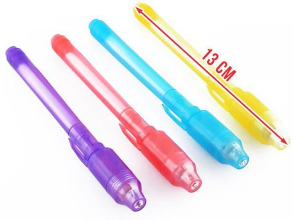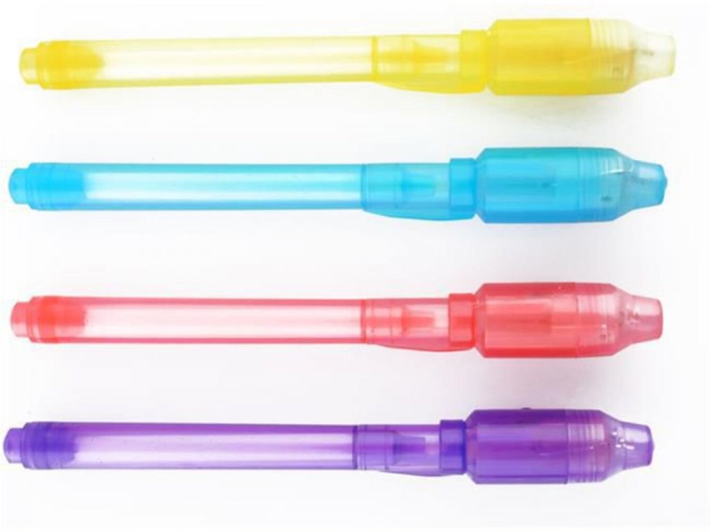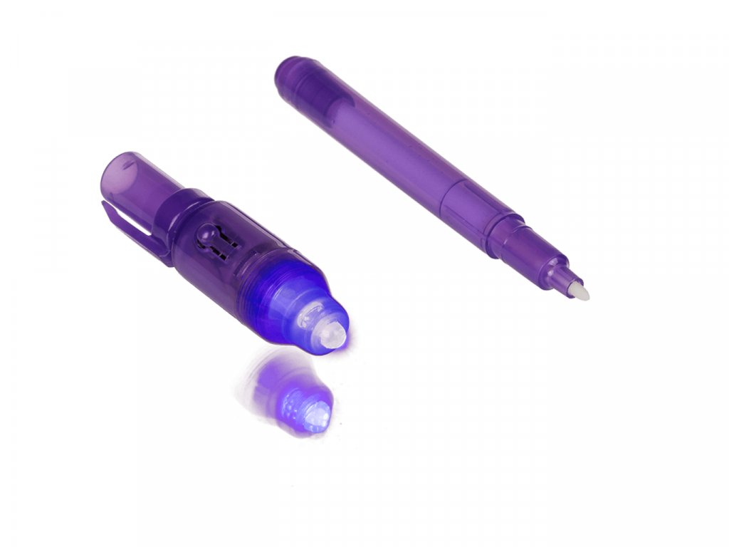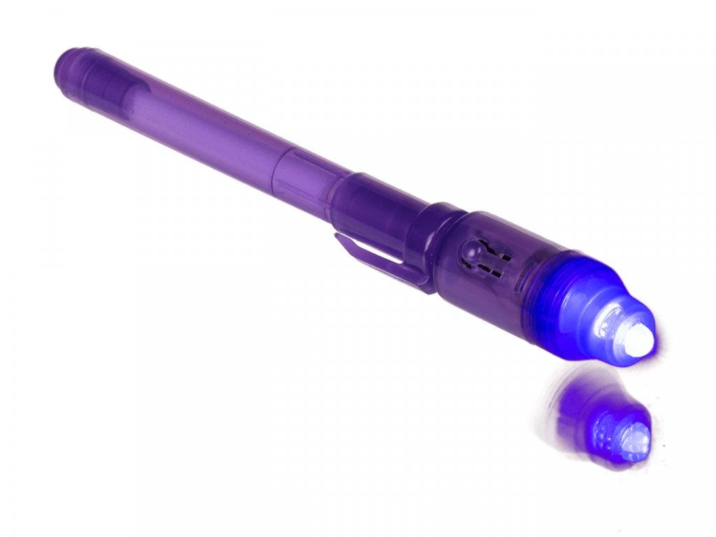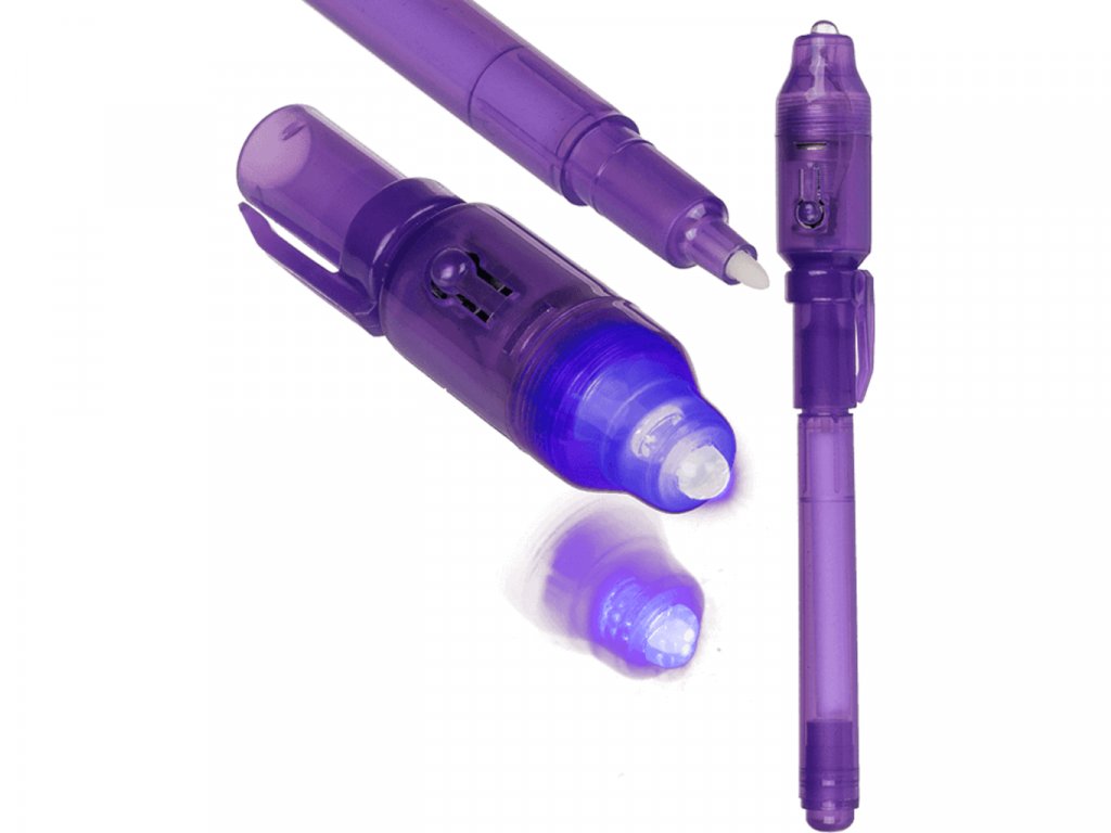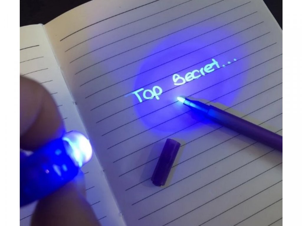 Toto originálne pero sa zapáči malým špiónom, ale aj vynaliezavým študentom. Pero je totiž naplnené atramentom, ktorý je viditeľný iba pod UV svetlom. Perom stačí niečo napísať, potom na nápis posvietiť priloženou UV lampou a text je náhle čitateľný. Takže, bez UV lampy Vám už pani učiteľka nikdy ťahák neodhalí. S týmto perom sa môžete stať aj kráľom diskotéky a okúzliť svoju vyvolenú aj bez tanca. UV lampička je samozrejme súčasťou balenia a slúži tiež ako vršok pera. Toto pero je dokonalý darček nielen pre Vaše malé ratolesti.