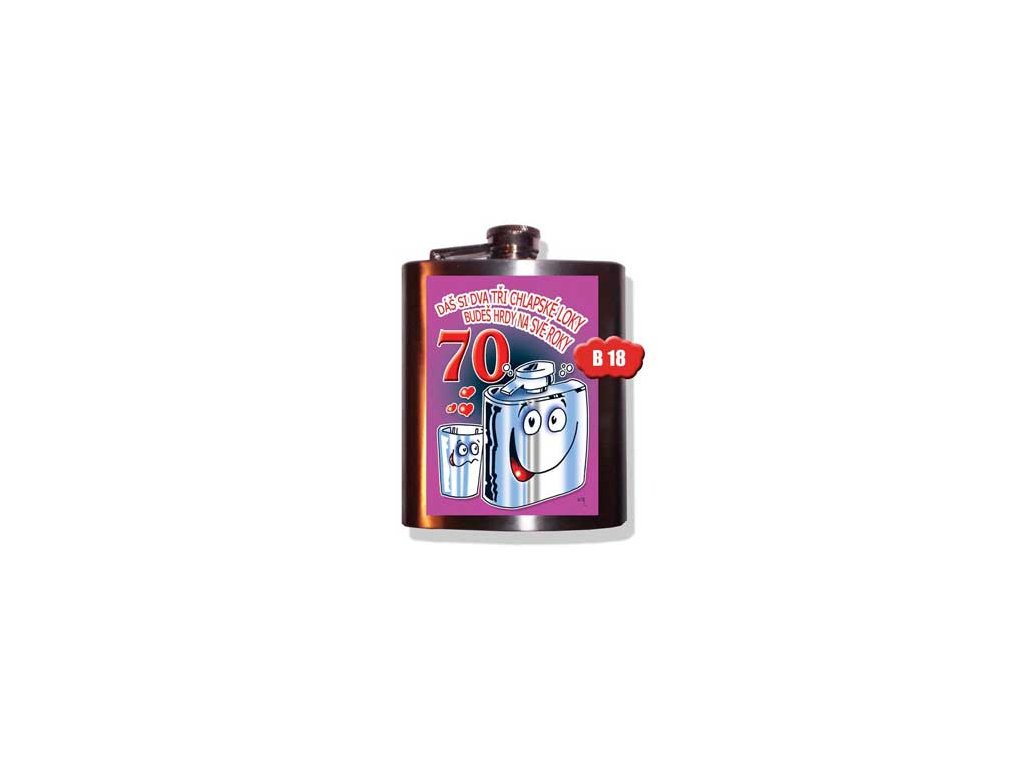 Váš starý otec alebo otecko oslavuje narodeniny a hľadáte pre neho najvhodnejší darček k jeho 70tke? Už nehľadajte a kúpte mu túto prvotriednu ploskačku. Ploskačka - Dáš si dva tri chlapské loky 70 povzbudí humorným nápisom a zachráni Vás v prípade, keď potrebujete dodať šťavu. Ploskačku môžete mať stále po ruke a nosiť v nej uschovaný Váš obľúbený alkoholický nápoj. Užívajte si život až do dna s touto netradičnou humornou ploskačkou pre pánov. Ploskačka - Dáš si dva tri chlapské loky 70 je originálny darček pre dedka alebo otecka.