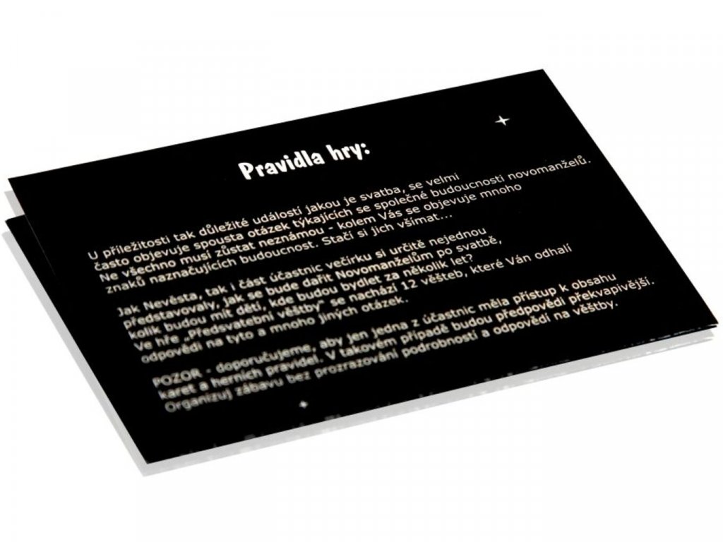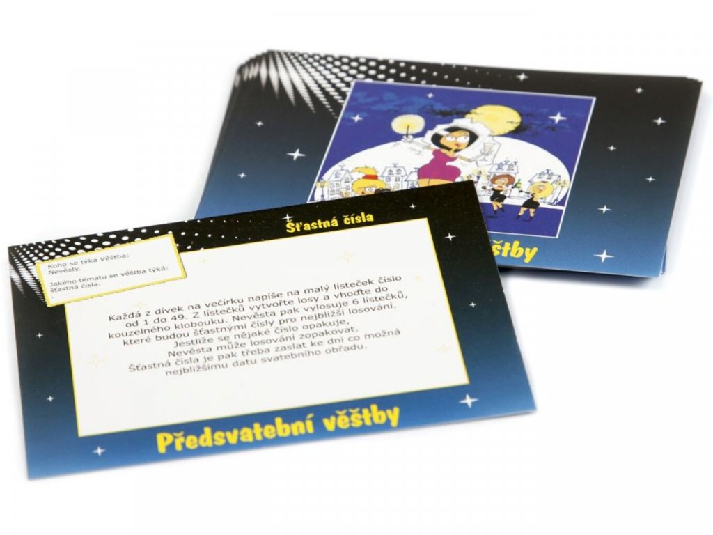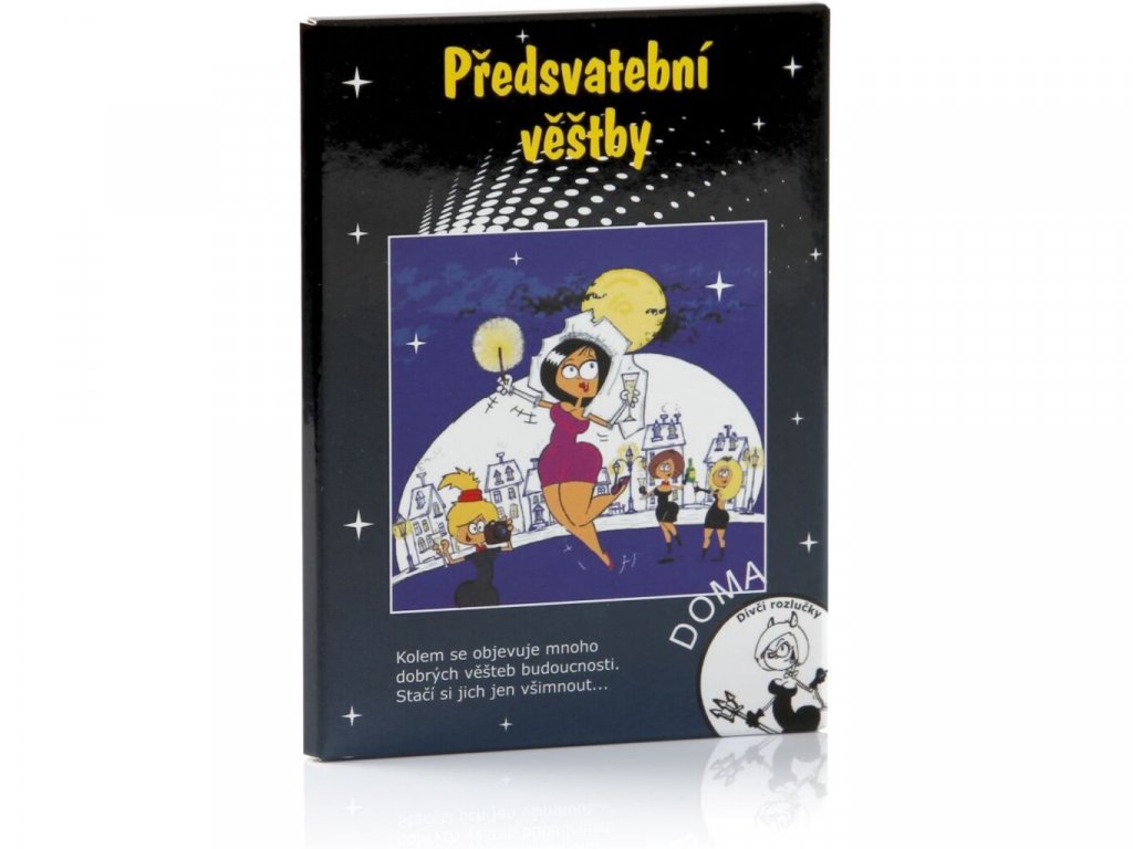 Usporiadajte svojej kamarátke rozlúčku so slobodou a pripravte jej nezabudnuteľné okamihy s touto úžasnou hrou predsvadobné veštby. Jedná sa o zábavnú stolný hru, ktorá Vám odhalí budúcnosť novomanželov a tiež účastníkov hry. Hra obsahuje 12 veštieb a poriadnu dávku tajomnej atmosféry, ktorú si počas hry užijete. Odhaľte tajomstvo a užite si mysteriózny večer. Predsvadobné veštby, je originálna stolová hra pre rozlúčku so slobodou.
