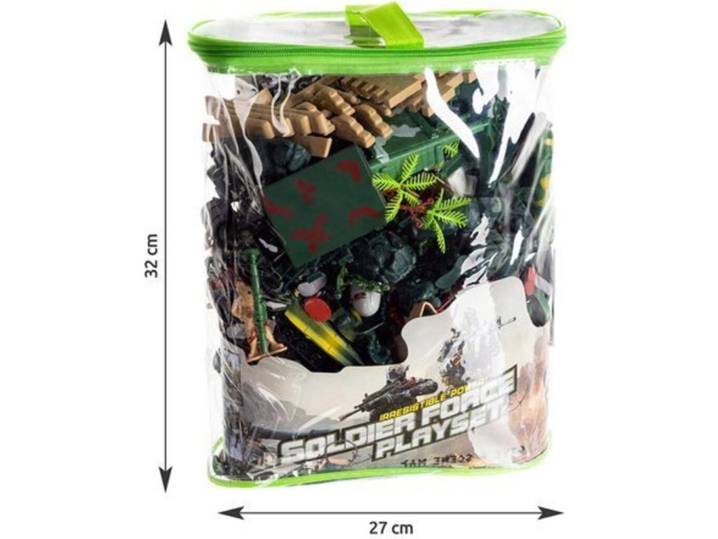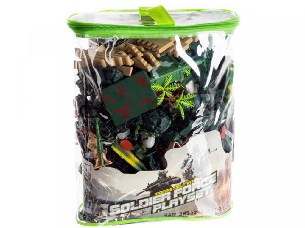 Táto jedinečná sada určite zaujme každého malého milovníka vojenstva. Sada obsahuje: vojaci, zbrane, tanky, lietadlá, ponorku, delá, budovy, ostnatý drôt, stromy a veľa ďalšieho príslušenstva . To umožní veľa hodín zábavy samostatne, s rovesníkmi alebo v rodine. Je to skvelý spôsob, ako sa zabaviť počas chladných alebo daždivých dní. Sada obsahuje špeciálne puzdro, zatvárateľné na zips, vďaka ktorému dieťa môže figurky bezpečne schovať po hre bez obáv, že ich môže stratíť. Kryt má rukoväť, vďaka ktorej môžete sadu ľahko vziať na ihrisko alebo do parku , čo zábavu ešte viac oživí. Sada perfektne pôsobí na predstavivosť a podnecuje kreativitu. Dieťa si musí samo vytvoriť cvičisko, základňu alebo bojište a plánovať a organizovať každý presun. Vytvorí vlastné jedinečné zápletky a premiestni sa do vojenskej reality. Figurky sú vyrobené z kvalitného plastu, sú ľahké a odolné voči pádom. Každá figurka stojí na malom podstavci, ktorý vám umožní mať väčšiu kontrolu nad zábavou a chrániť pred náhodnými pádmi figúrok.