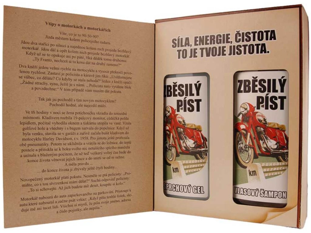 Máte kamaráta, známeho, člena rodiny, či kolegu ktorý je nadšený motorkár a srdce mu bije len pre túto činnosť? V tom prípade je pre neho tento darček ako ušitý. Kozmetická kniha pre motorkárov v sebe ukrýva originálny kozmetický set v podobe sprchového gélu a šampónu na vlasy s výťažkami z pravého olivovníka. Po otvorení tejto darčekovej knižky si obdarovaný môže hneď na prvej strane navyše prečítať tie najlepšie vtipy o motorkároch a celý darček tak nadobudne úplne nový rozmer. Darujte ozajstným motorkárom tento netradičný darček a vyčarujte im úsmev na perách.