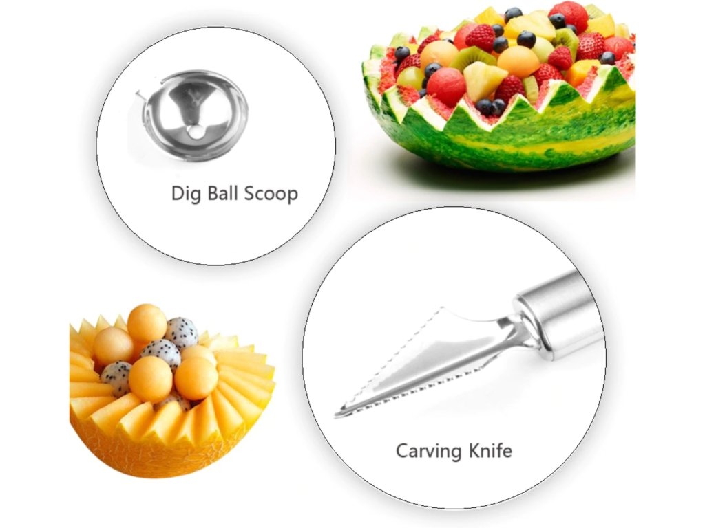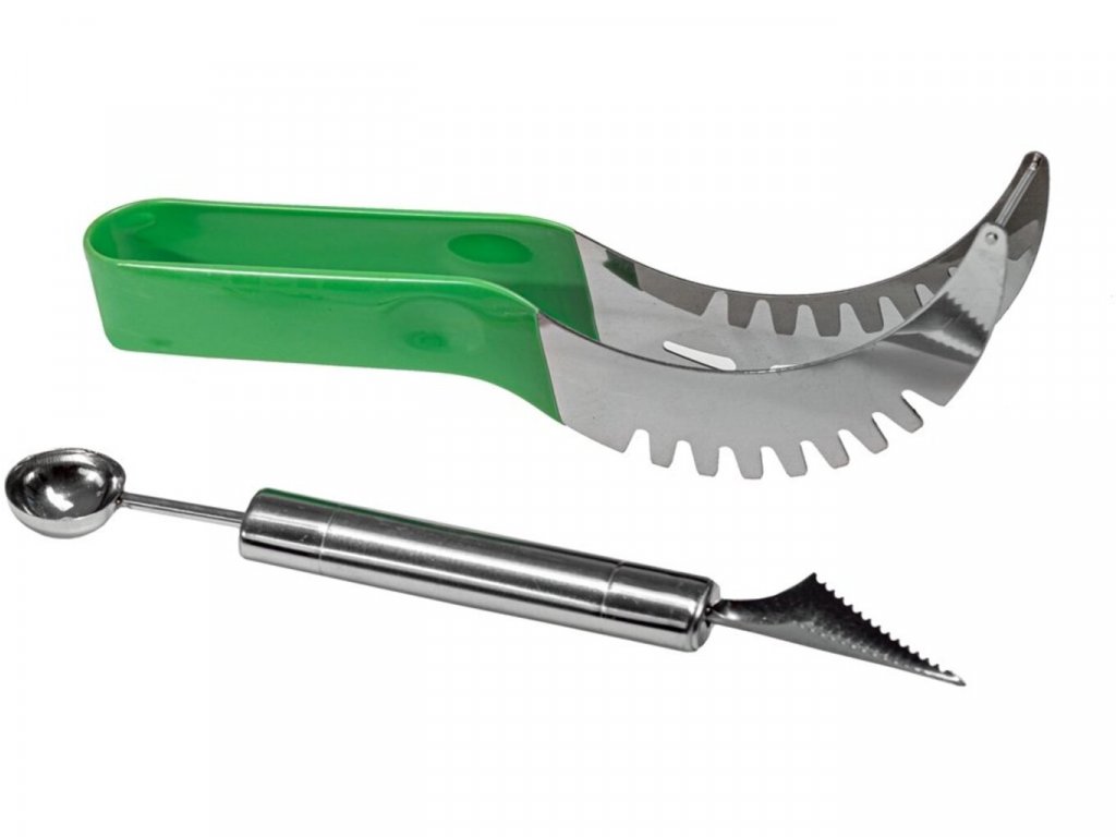 Skvelá sada pre krájanie a vykrajovanie ovocia. Nôž a špeciálny dekoratívny nôž v jednej sade. Dlho je známe, že "jesť sa musí aj očami", a preto krásne servírované ovocné občerstvenie nielen poteší naše oči, ale tiež bude chutiť oveľa lepšie. Nôž je skvelý pre efektívne krájanie a podávanie melónu alebo exotického ovocia, ako je papaya, ale môžete ním tiež nakrájať a podávať nejaké koláče. Vďaka obojstrannému ozdobnému nožu budete môcť vyrábať ovocné alebo zeleninové guľôčky, zúbkovaný špíz vám umožní rezať pútavé vzory v ovocí alebo zelenine.