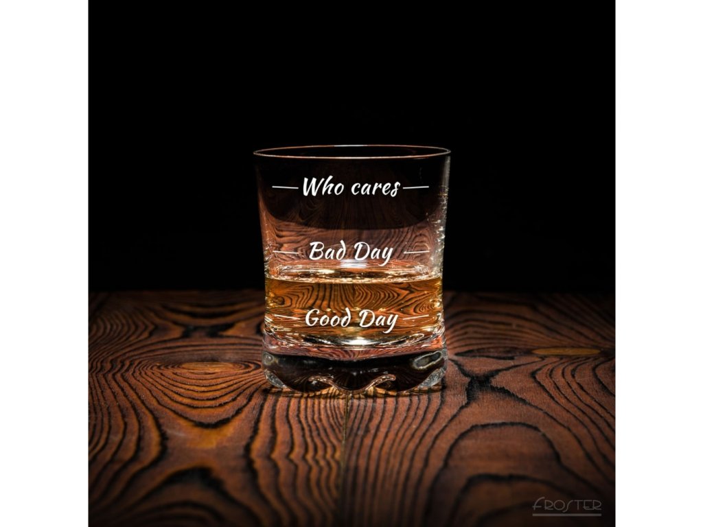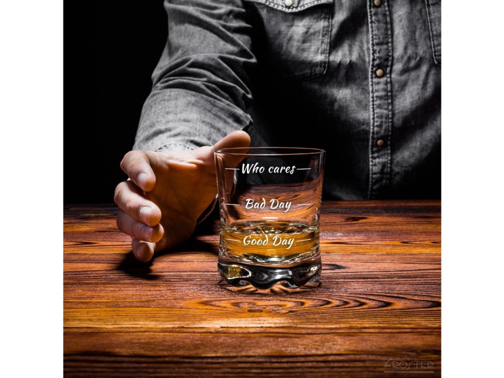 - Poháre whisky s tromi úrovňami: Good Day (dobrý deň), Bad Day (zlý deň) a Who cares (koho to zaujíma)