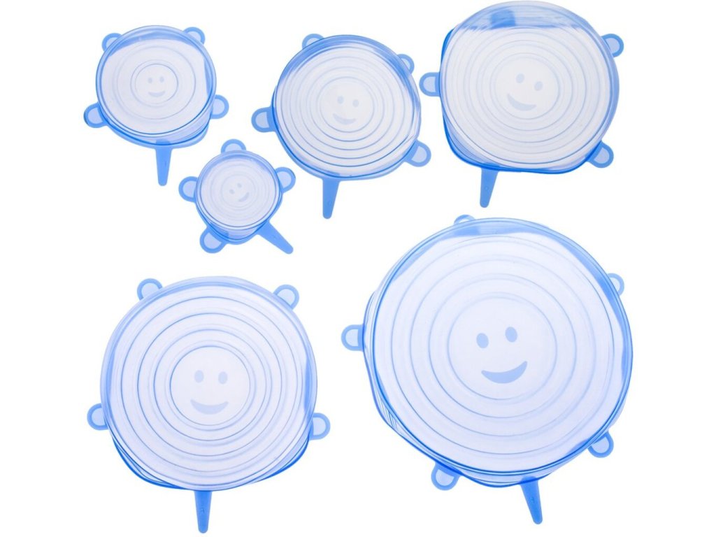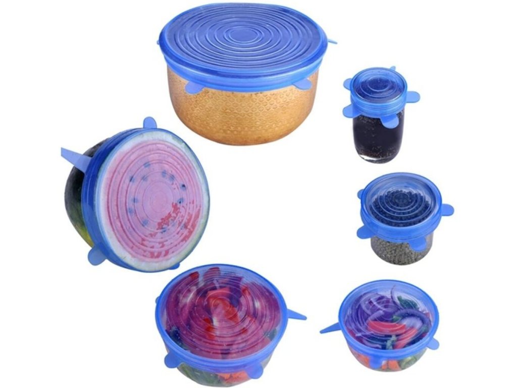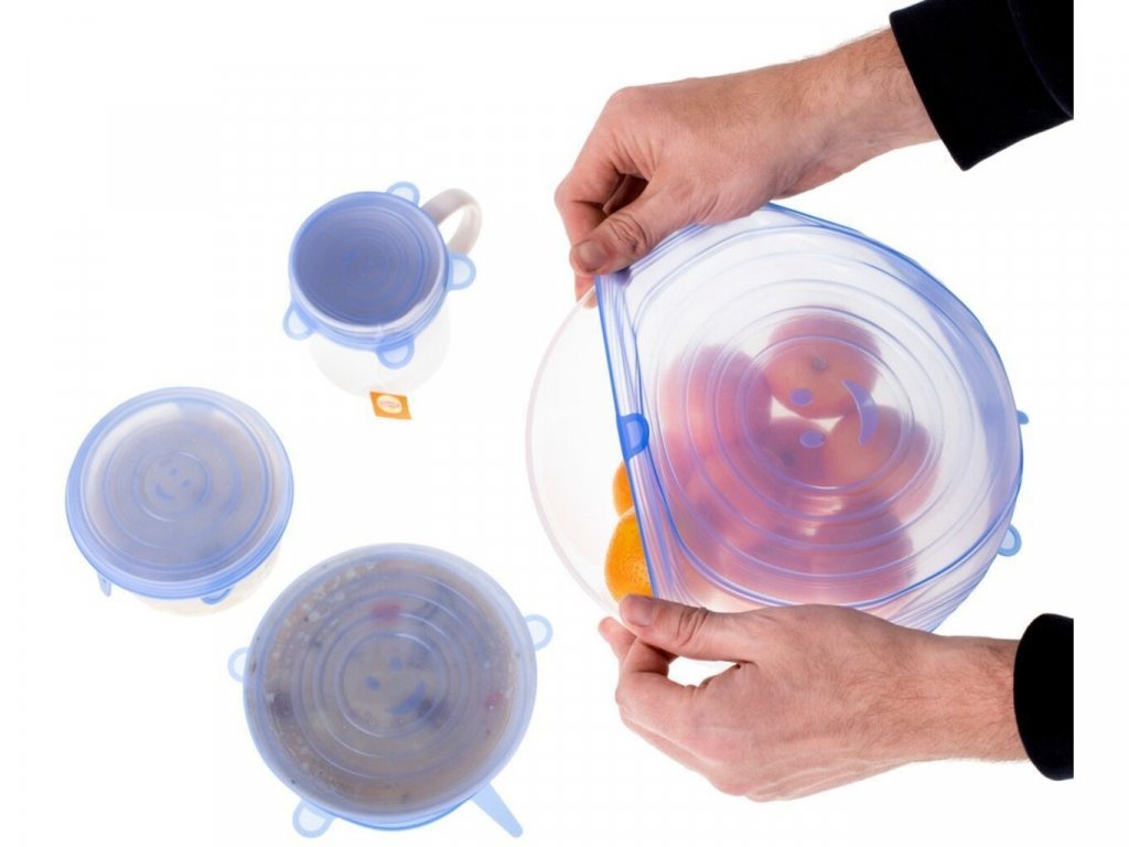 - Sada obsahuje 6 pružných silikónových viečok, ktoré je možné naťahovať na riad alebo ovocie a zeleninu