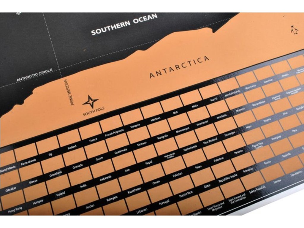 Veľká stieracia mapa sveta s vlajkami Deluxe 82 x 59 cm bez príslušenstva je perfektná pomôcka pre každého cestovateľa. Mapa je v elegantnom čiernom prevedení, ktoré je kombinované s luxusnou zlatou farbou pre dosiahnutie maximálnej elegancie v každom interiéri. Každá z krajín a kontinentov bola pokrytá hliníkovou stieracou fóliou, ktorá má jednotnú farbu, po zotretí sa však zobrazia rôzne odtiene, krásna scenéria a presné obrysy jednotlivých krajín. Je vhodná ako pre dospelých tak aj pre deti ako výuková pomôcka.
