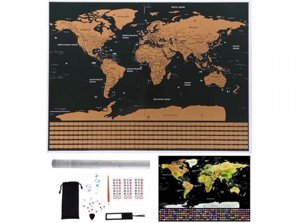 Veľká stieracia mapa sveta s vlajkami Deluxe je perfektná pomôcka pre každého cestovateľa. Mapa je v elegantnom čiernom prevedení a v tejto unikátnej sade nájdete množstvo zaujímavého príslušenstva na upevnenie či vylepšenie samotnej mapy. Bola kombinovaná s luxusnou zlatou farbou pre dosiahnutie maximálnej elegancie v každom interiéri. Každá z krajín a kontinentov bola pokrytá hliníkovou stieracou fóliou, ktorá má jednotnú farbu, po zotretí sa však zobrazia rôzne odtiene, krásna scenéria a presné obrysy jednotlivých krajín.