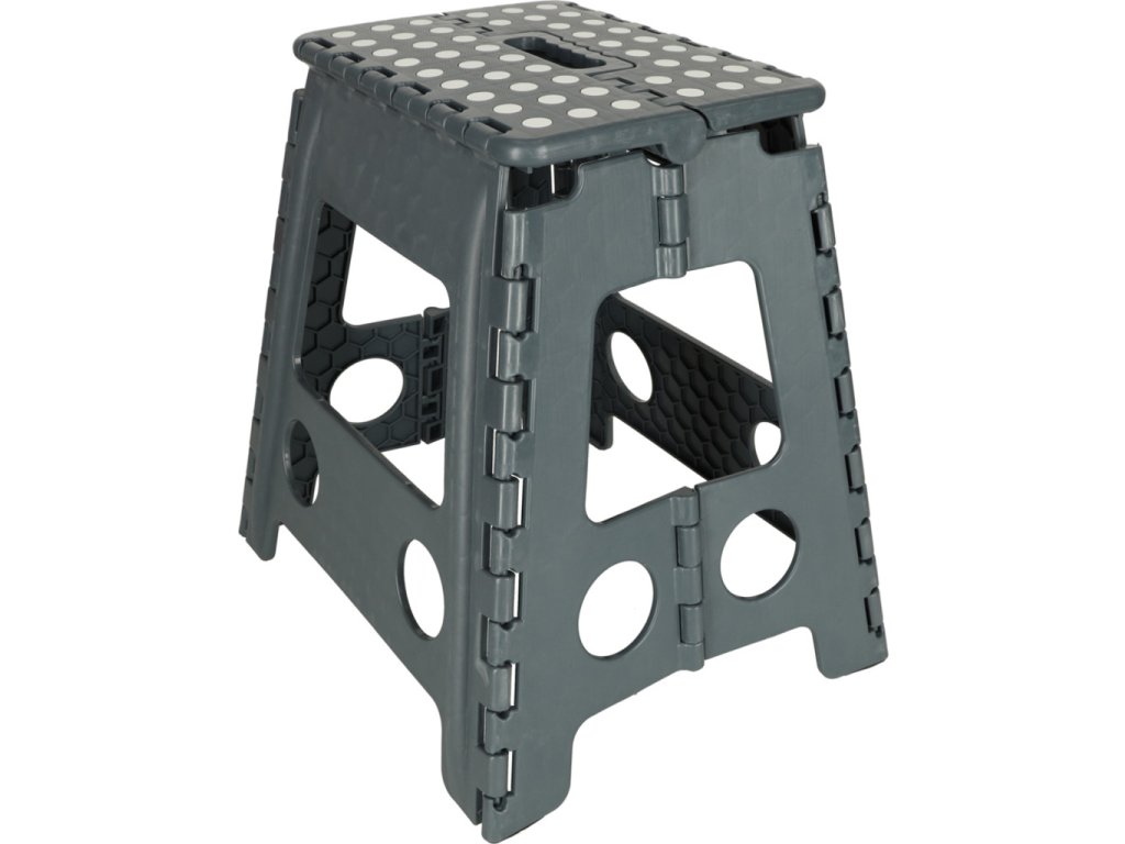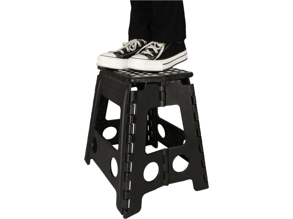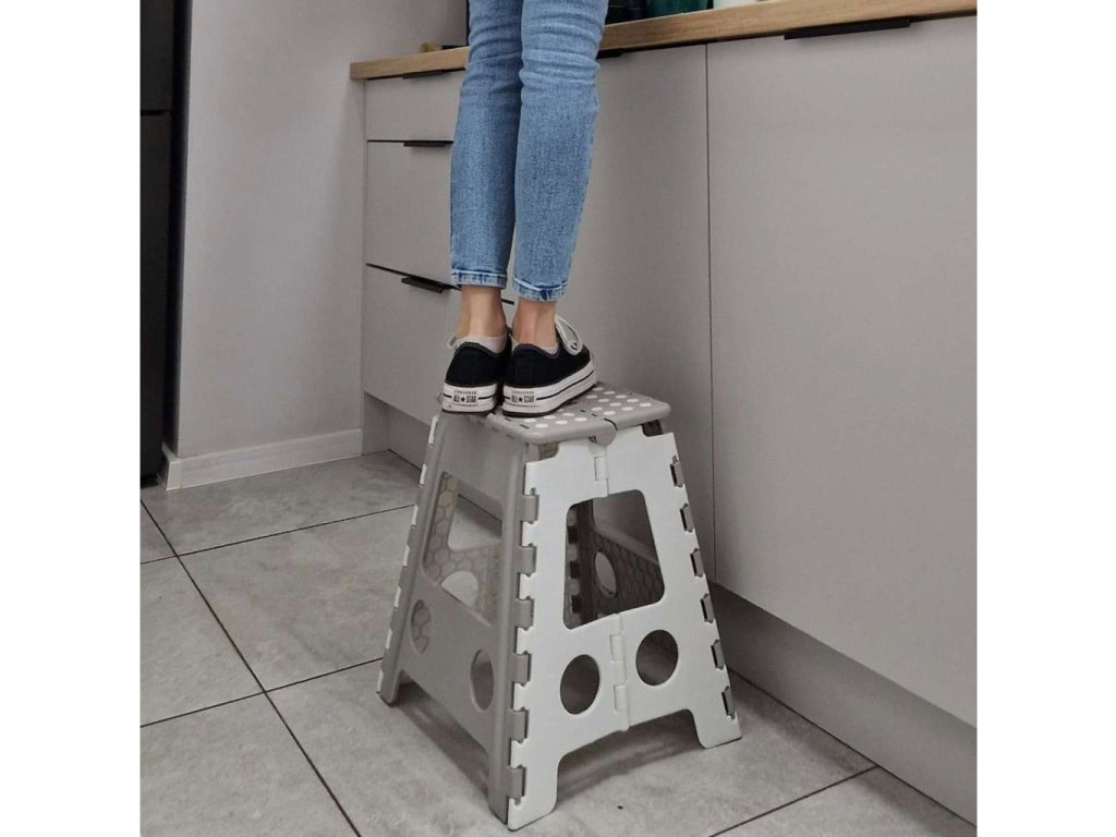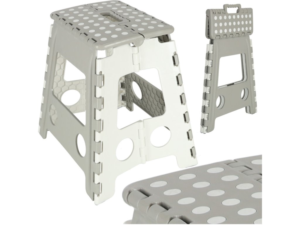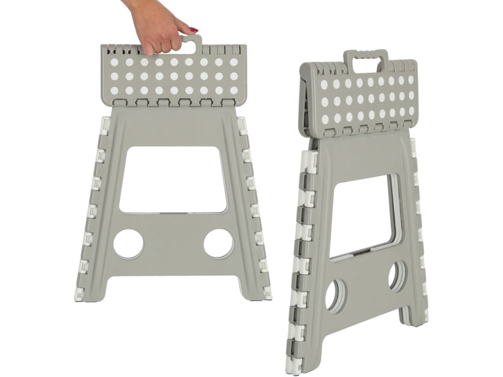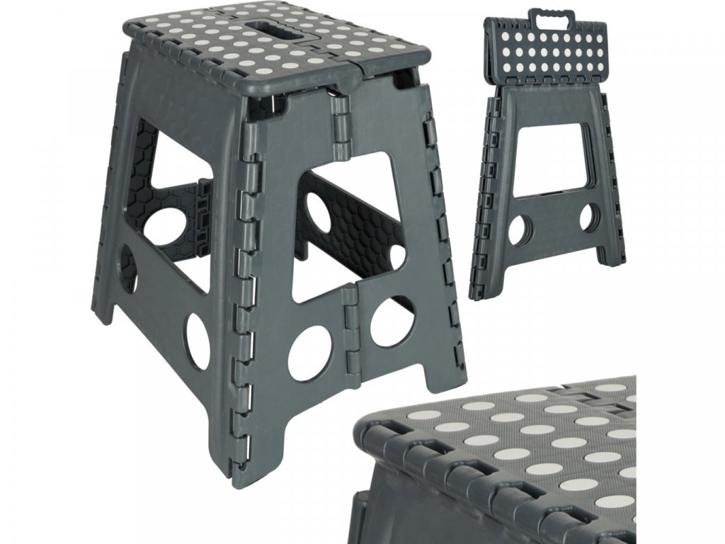 Skladacia stolička v čiernej, sivej alebo svetlo sivej farbe je vysoká 39 centimetrov, takže sa ľahšie dostanete na ťažko dostupné miesta. Je skladací, takže keď sa nepoužíva, zaberie málo miesta . Má protišmykovú úpravu zabezpečujúcu bezpečnosť pri používaní. Stolička je vyrobená z odolného plastu , čo je potvrdené certifikátom CE. Výrobok je balený vo fólii.
