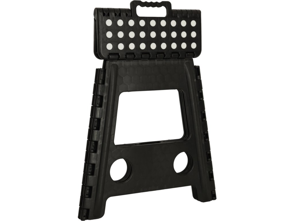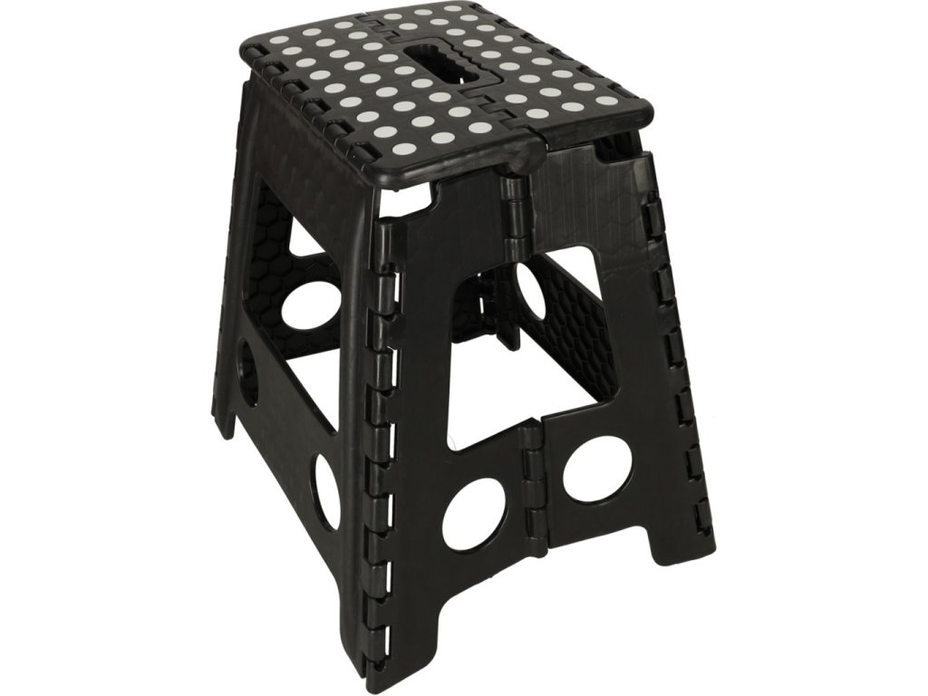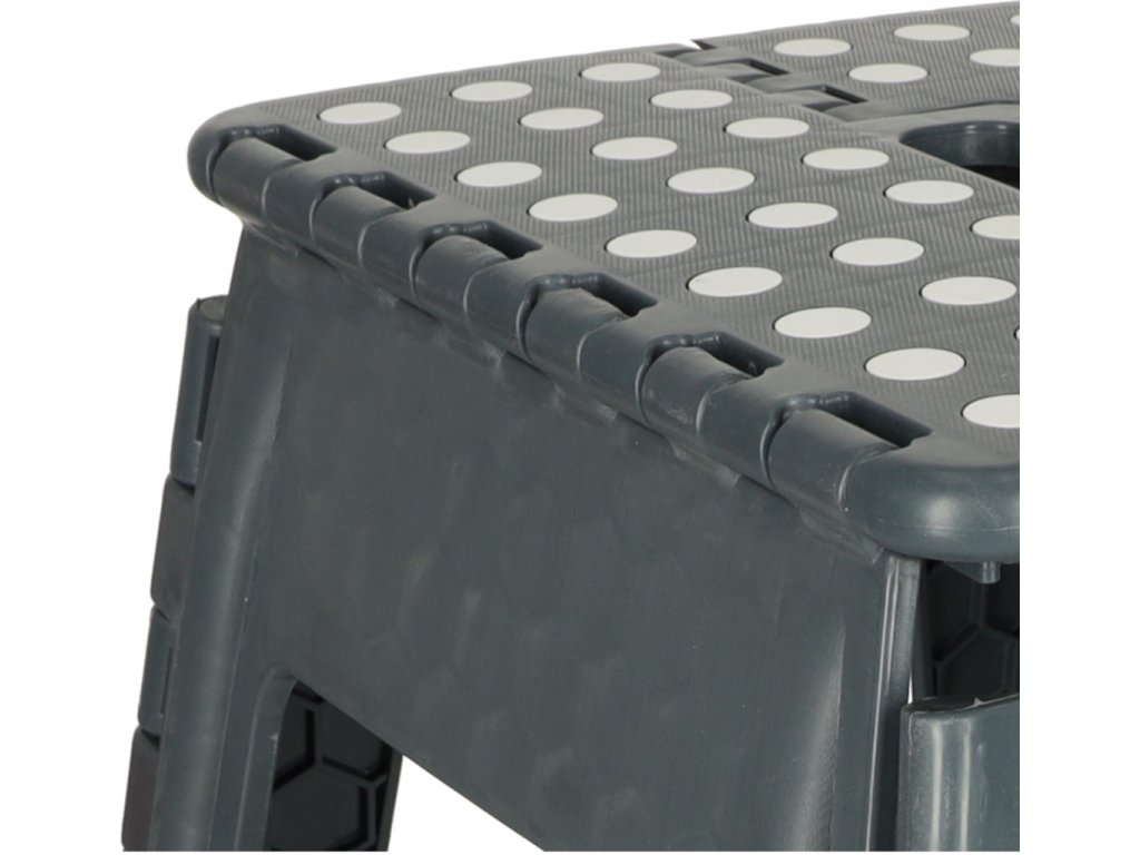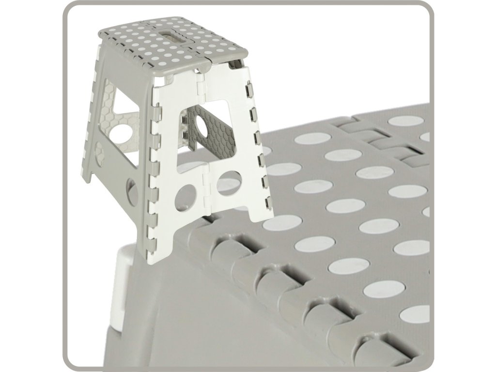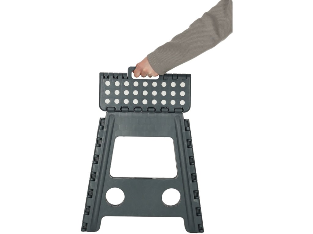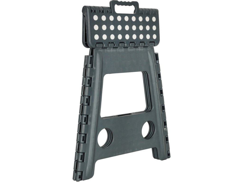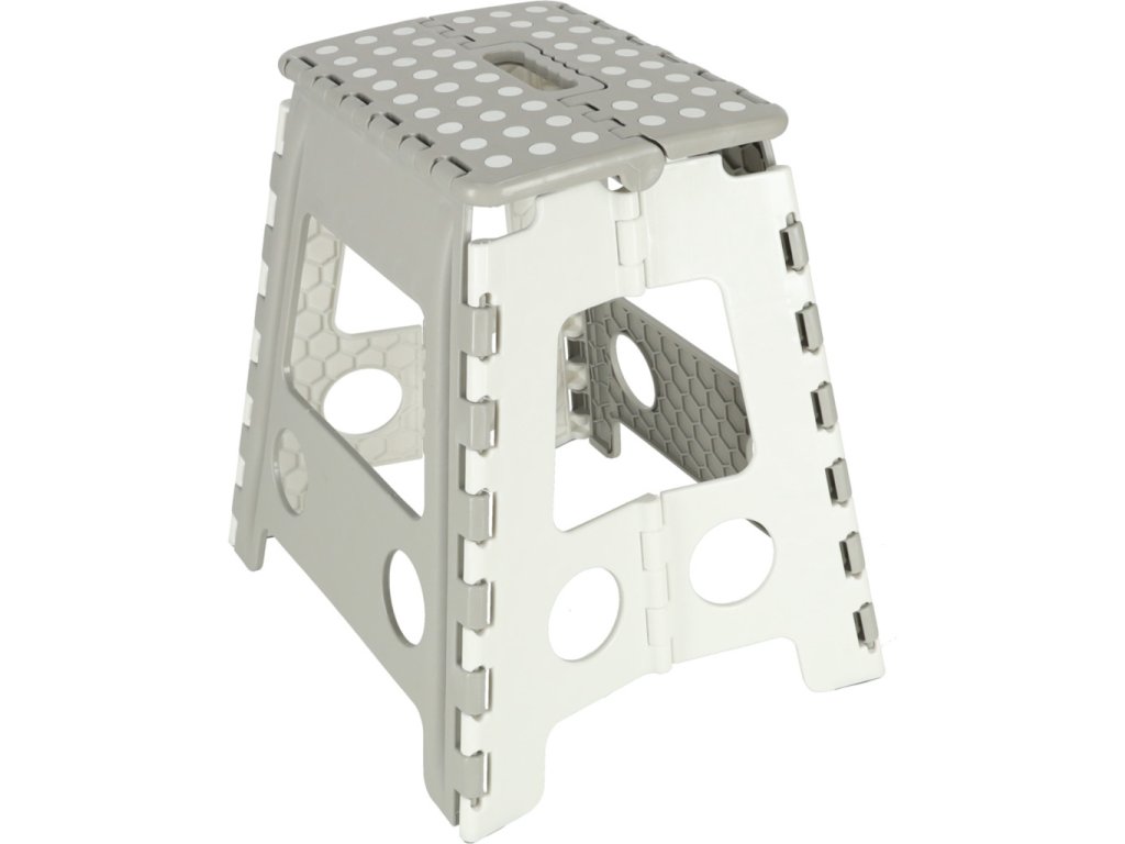Skladacia stolička v čiernej, sivej alebo svetlo sivej farbe je vysoká 39 centimetrov, takže sa ľahšie dostanete na ťažko dostupné miesta. Je skladací, takže keď sa nepoužíva, zaberie málo miesta . Má protišmykovú úpravu zabezpečujúcu bezpečnosť pri používaní. Stolička je vyrobená z odolného plastu , čo je potvrdené certifikátom CE. Výrobok je balený vo fólii.