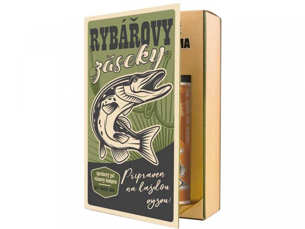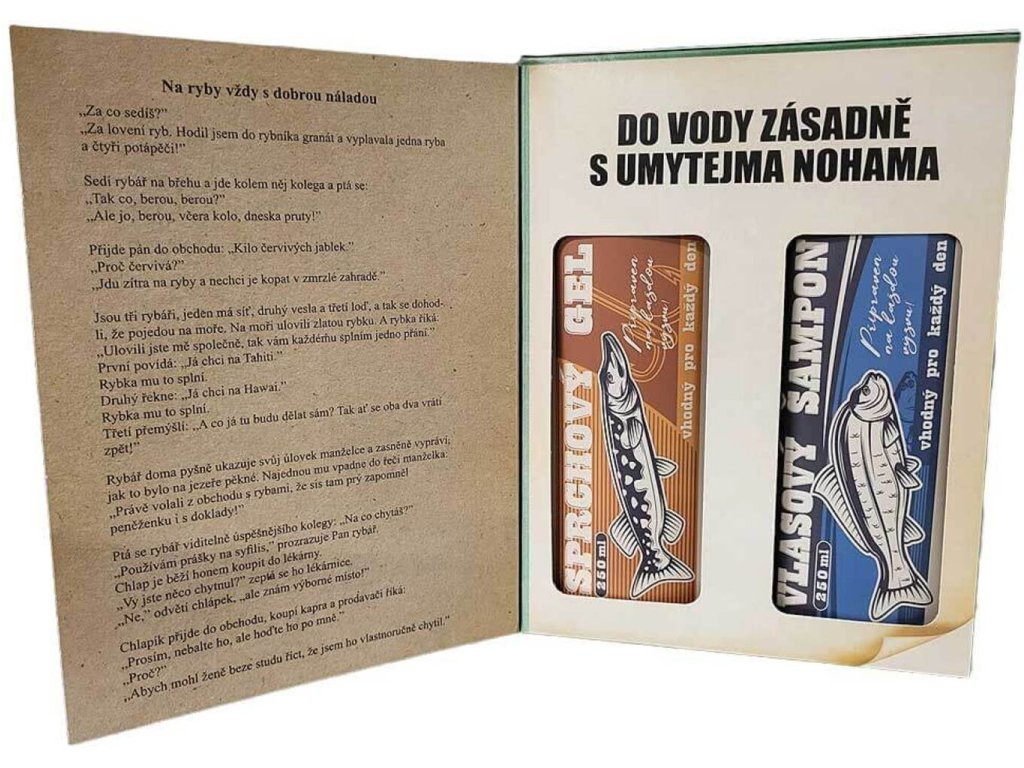 Kozmetický balíček sprchového gélu a šampónu na vlasy ako originálny darček pre rybárov a milovníkov rybolovu v darčekovej škatuľke s motívom knihy pre rybárov. Prelistujte si prednú stranu balíka a prečítajte si niekoľko rybárskych vtipov.