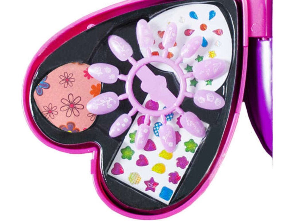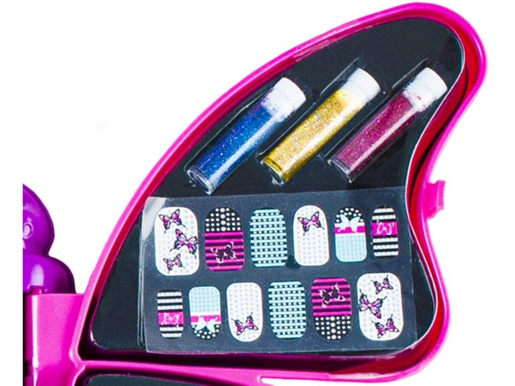 Už Vás nebaví stále dokupovat oční stíny podle toho, jaké šaty si zrovna koupíte? Můžete to vyřešit velmi jednoduše. Tato jedinečná sada na líčení obsahuje vše, co bude malý stylista potřebovat. Uzavřené pouzdro obsahuje: 6 stínů, 12 nálepek na nehty, 12 papírových imitací nehtů, 3 třpytky, 44 ozdob na nehty; 8 lesků na rty, pilník na nehty, 7 třpytivých lesků na rty, 3 aplikátory, šablona a zrcátko . Tato sada byla vyrobena s důrazem na všechny detaily, díky čemuž působí výjimečně stylově a profesionálně. Sada je v dívčím uzavíratelném pouzdře ve tvaru motýla . Po složení se bude skvěle vyjímat na poličce nebo psacím stole - jako jednoduchá dekorace. Sada obsahuje i zrcadlo, které rozhodně usnadní všechny druhy stylingu. Malá stylistka je může držet v ruce nebo dát na speciální místo v těle motýla. Sada působí dívčím a profesionálním dojmem zároveň. Díky tomu bude dívka moci hrát roli malé stylistky a udělat si vlastní make-up nebo lakovat nehty . Díky takové kreativní hře bude rozvíjet fantazii a estetické cítění.