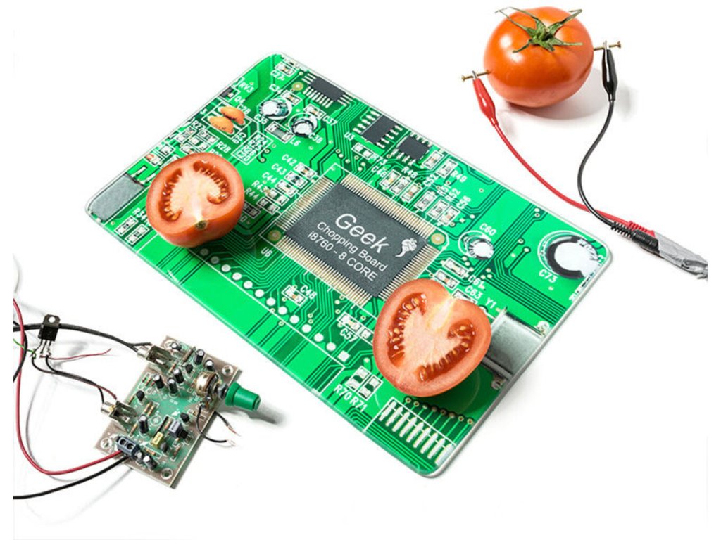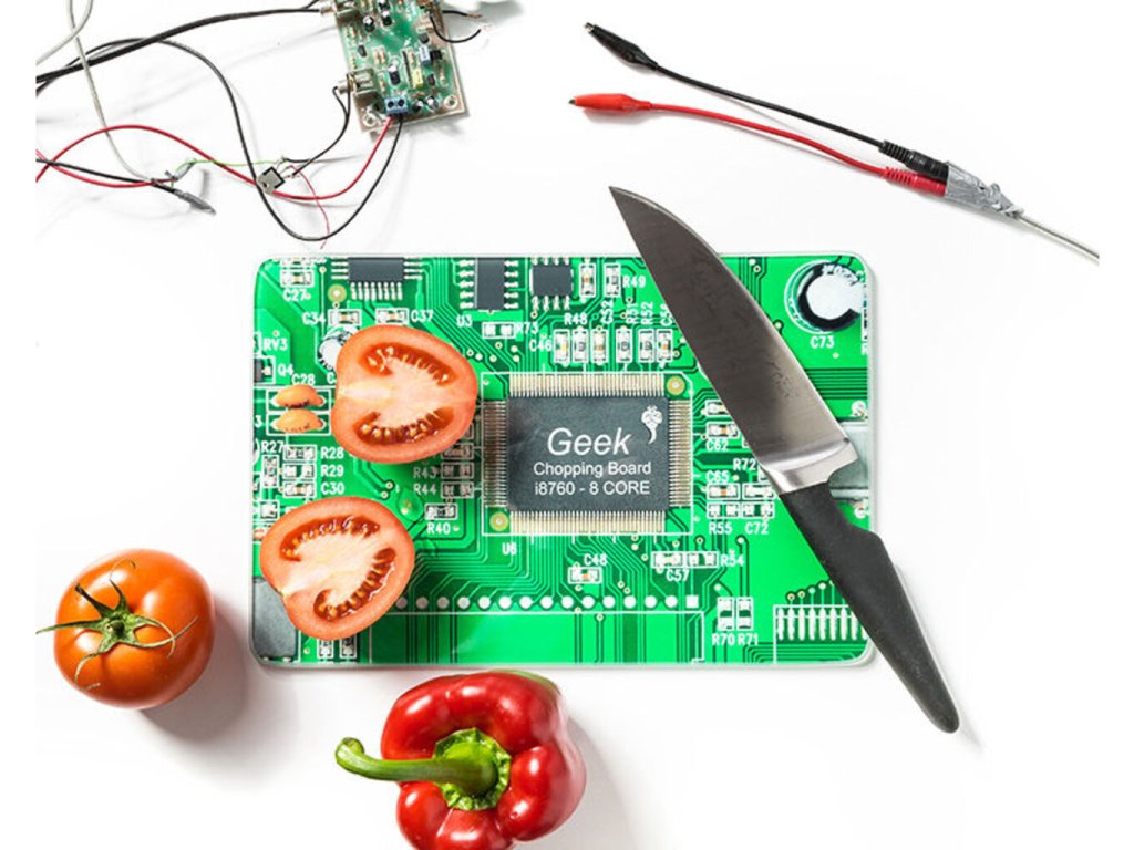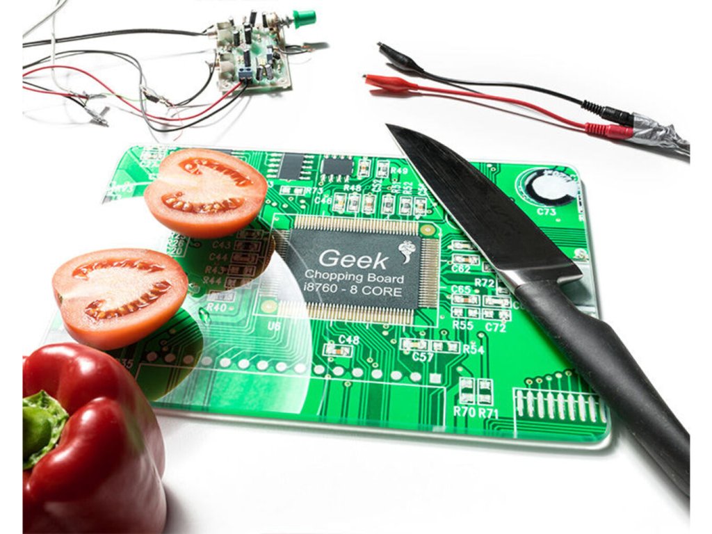Máte doma technického kutila, ktorý sa vareniu oblúkom vyhýba? S touto doskou na krájanie ho už viac nebudete musieť prehovárať. Vášho pomocníka zláka do kuchyne jej jedinečný dizajn imitujúci dosku plošných spojov. Pri krájaní zeleniny sa bude váš milovník elektroniky cítiť ako ryba vo vode. Šalát bude hotový skôr, než svoju podložku dôkladne preskúma. Doska na krájanie v dizajne základnej dosky je ideálnym darčekom pre každého domáceho kutila a opravára.