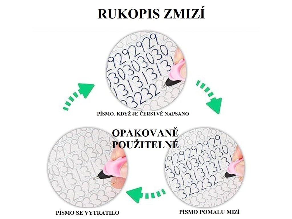 - opakovateľne použiteľná - atrament automaticky vybledne cca po 20 minútach po zapísaní