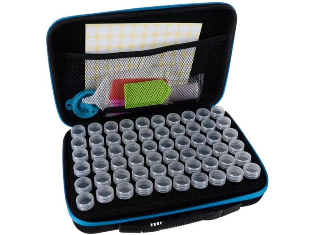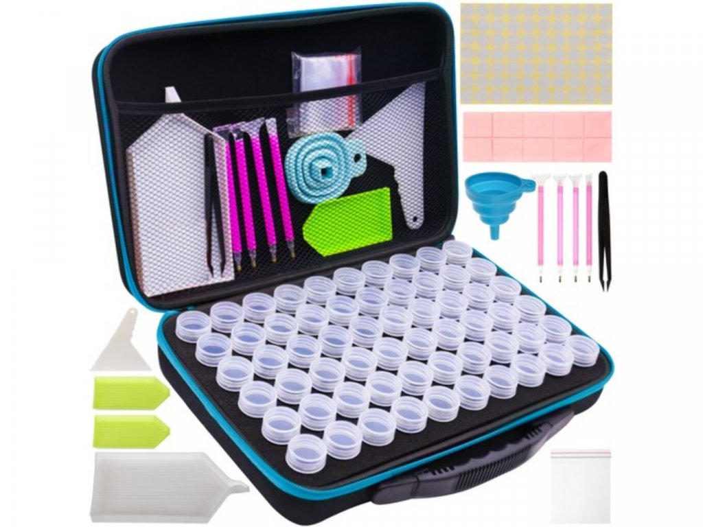 Príslušenstvo pre diamantové vyšívanie je skvelý spôsob, ako si udržať organizáciu pri vyšívaní. Všetko je zabalené v pevnom kufríku ako kufor. Diamantové nádoby sú uložené v špeciálnom výlisku a je tu aj vrecko na ostatné príslušenstvo. Kufrík má aj pohodlnú rukoväť, ktorá uľahčuje prenášanie súpravy. Súprava je mimoriadne praktickým doplnkom, ktorý okrem iného obsahuje špachtľu na lisovanie a vyrovnávanie diamantov. Obsahuje zásobníky na diamanty a nálepky na označenie diamantov, ktoré uľahčujú udržiavanie poriadku a starostlivé oddeľovanie prvkov súpravy.