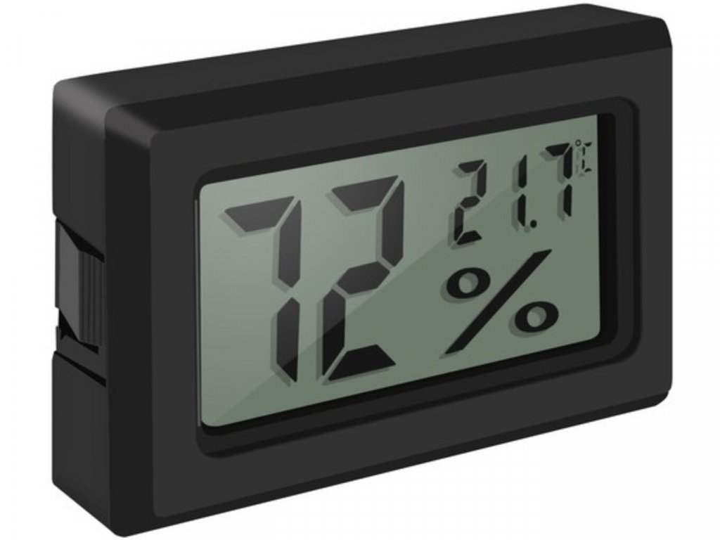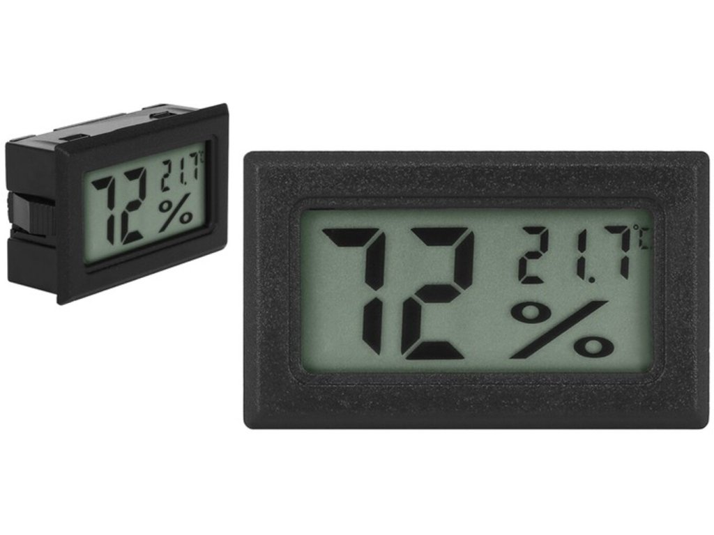 Elektronický vlhkomer s teplomerom s veľkým LCD displejom - umožní odčítať meranie aj na veľkú vzdialenosť. Zariadenie sa vyznačuje dobrým rozlíšením merania a rýchlosťou odozvy. Stačí ho položiť na otvorenú ruku a takmer okamžite vidíte reakciu zariadenia. Teplomer je vybavený špeciálnymi chvostíkmi, ktoré umožňujú jeho držanie v otvore 2,6/4,5-2,6/4,7 cm. Vďaka tomu ho môžete umiestniť napríklad do krytu akvária. Súprava obsahuje sadu batérií, takže teplomer je pripravený na použitie. Teplomer je napájaný dvomi batériami LR44 1,5V, ktoré zabezpečujú dlhú životnosť. Prístroj umožňuje veľmi rýchle meranie teploty a vlhkosti. Odozva zariadenia je len 1 sekunda. Umožňuje čítať dáta aj na veľkú vzdialenosť. Teplomer je vybavený špeciálnymi chvostíkmi, ktoré umožňujú jeho držanie v otvore 2,6/4,5-2,6/4,7 cm. Vďaka tomu ho môžete umiestniť napríklad do krytu akvária. Výrobok umožňuje široký rozsah merania; teploty od -50°C do 70°C, vlhkosti od 10%RH do 99%RH. Okrem merania teploty a vlhkosti vzduchu je možné prístroj použiť aj na meranie v humidóroch s doutníkmi, na meranie vlhkosti v autách, drevných puzdrách, napríklad pre hudobné zariadenia atď.
