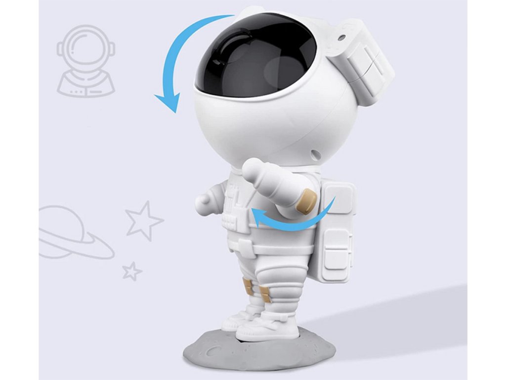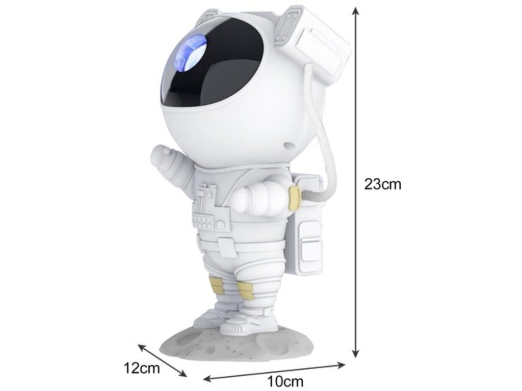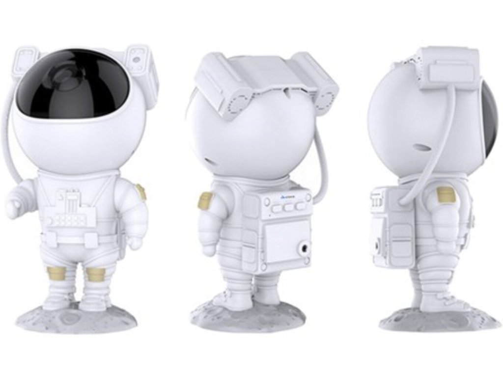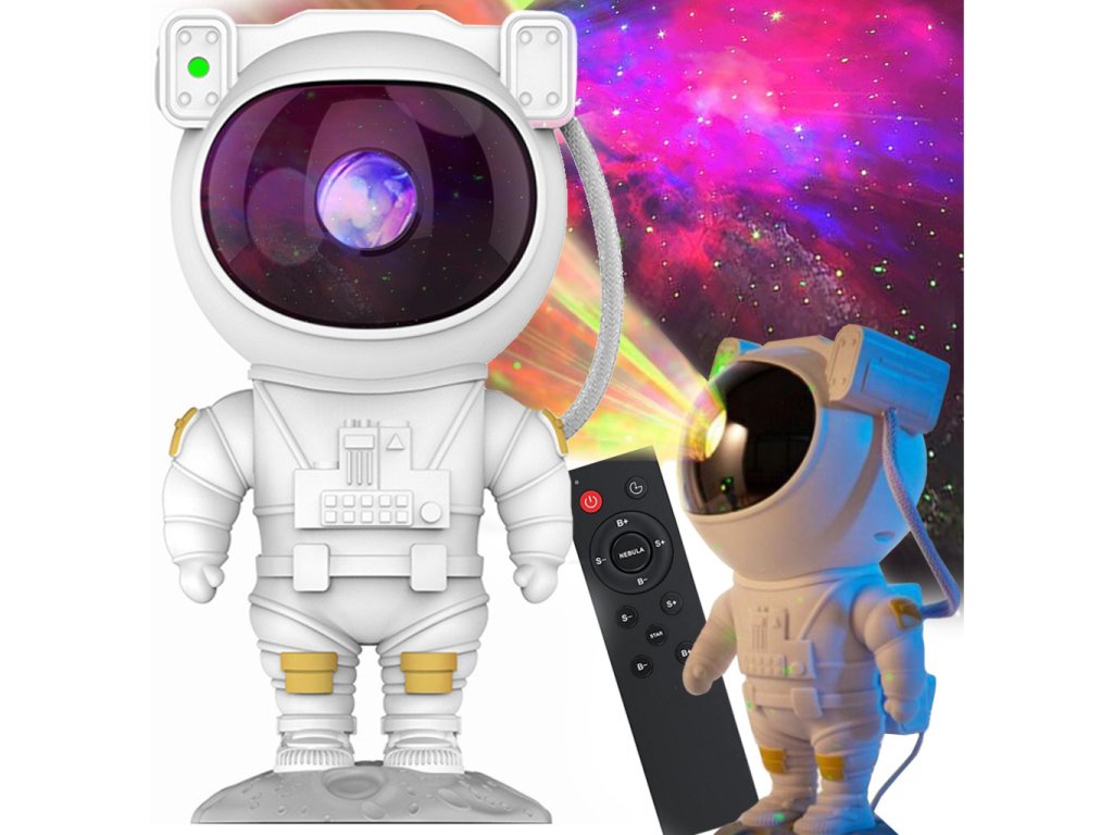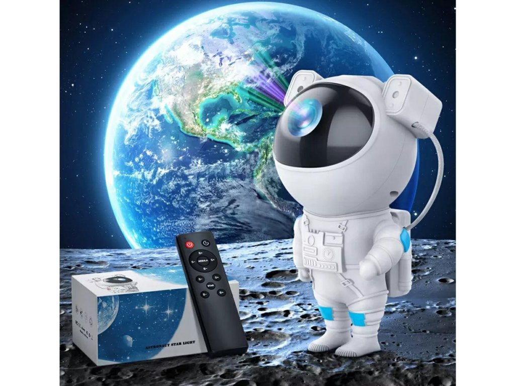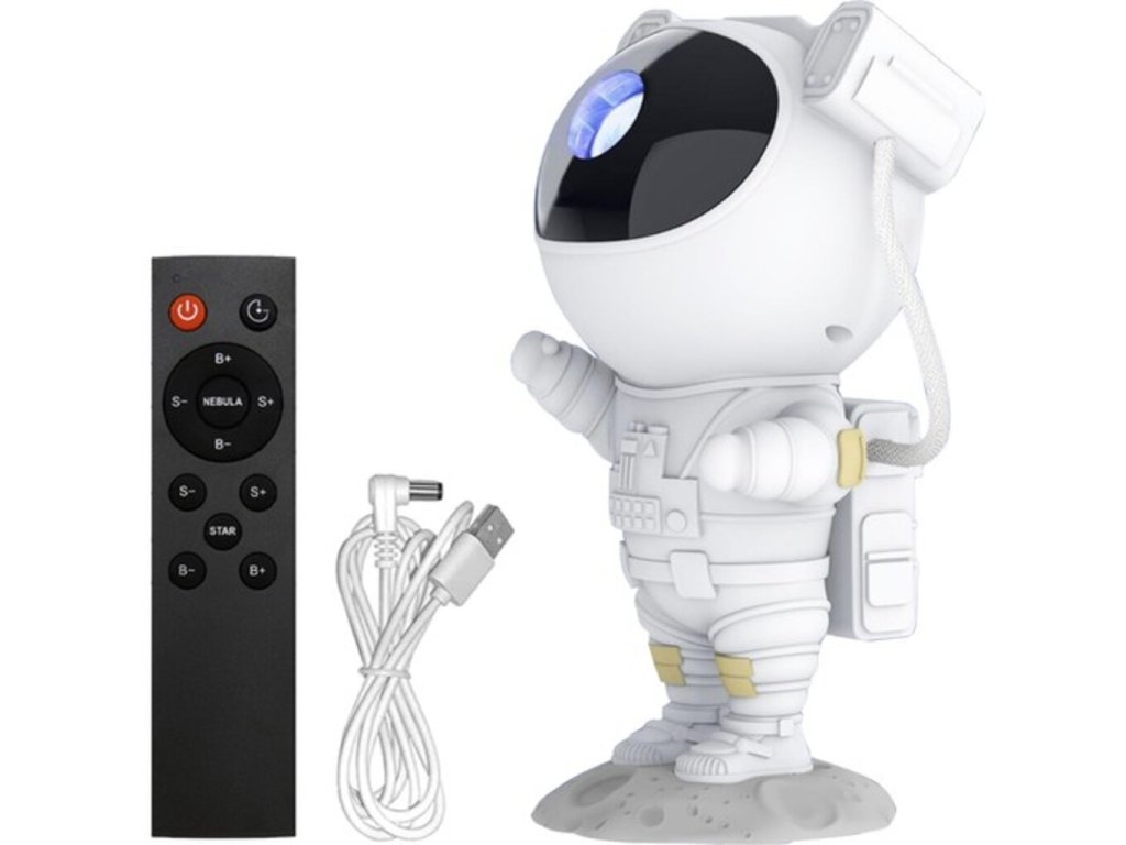 Projektor v tvare milého kozmonauta je ideálnou voľbou pre tých, ktorí chcú pridať do svojho interiéru čaro a vtipný prvok. Kozmonautova helma je magneticky pripevnená k telu, čo umožňuje plynule nastaviť uhol hviezd a hmloviny. Kozmonaut je umiestnený na mesačnom stojane, ktorý možno ľubovoľne nastaviť, a pohyblivé prvky z figúrky robia z projektora skvelú hračku aj dekoráciu. Sada je vybavená diaľkovým ovládaním pre pohodlné ovládanie zariadenia. Projektor kozmonauta je multifunkčný – funguje ako lampa aj projektor a poskytuje relaxačnú atmosféru s realistickou hviezdnou oblohou. Navyše s možnosťou premietať hviezdy a galaxie až v 8 režimoch a s otočnou hlavou umožňujúcou projekciu v širokej rovine je tento LED projektor v tvare kozmonauta perfektným darčekom pre deti aj dospelých.