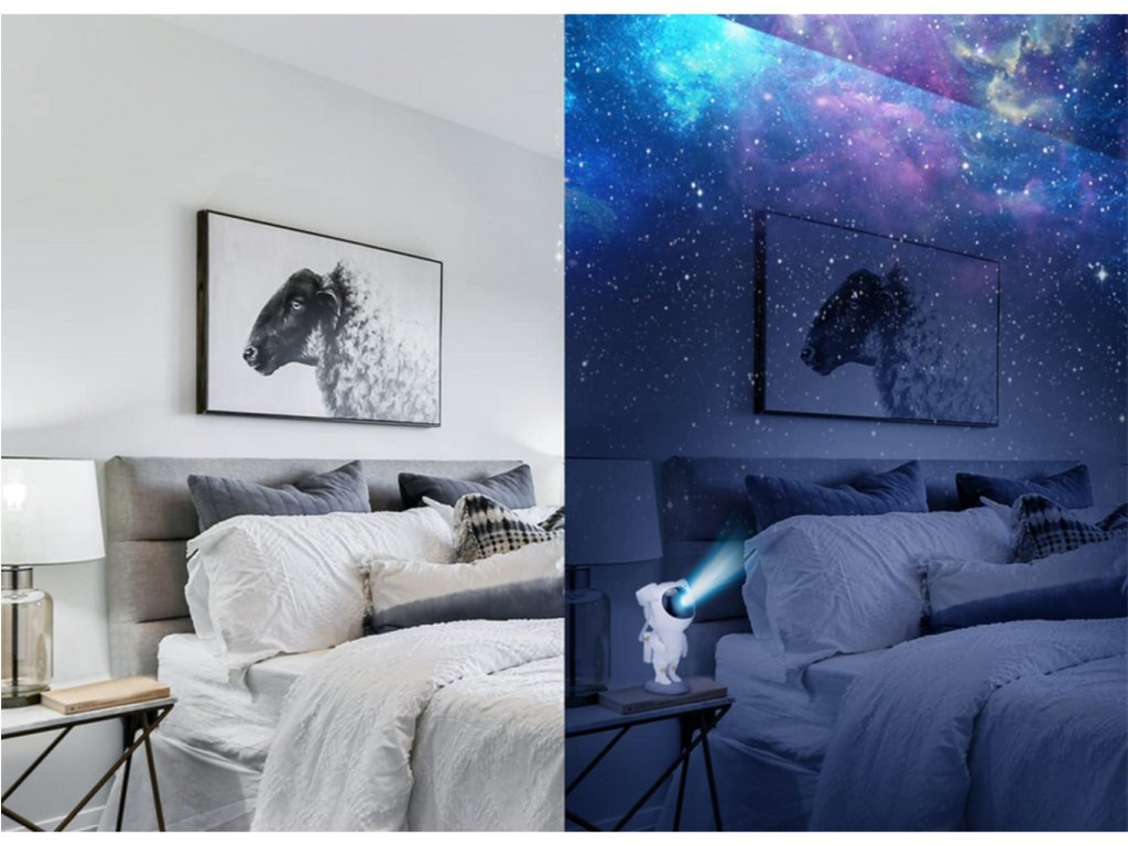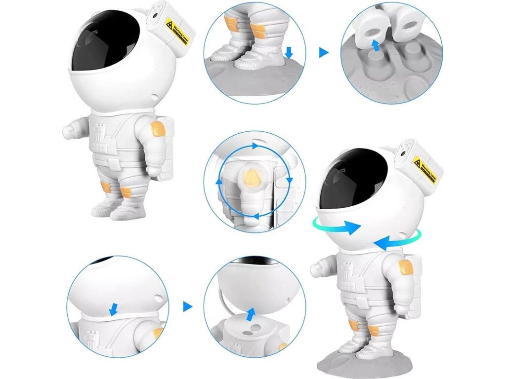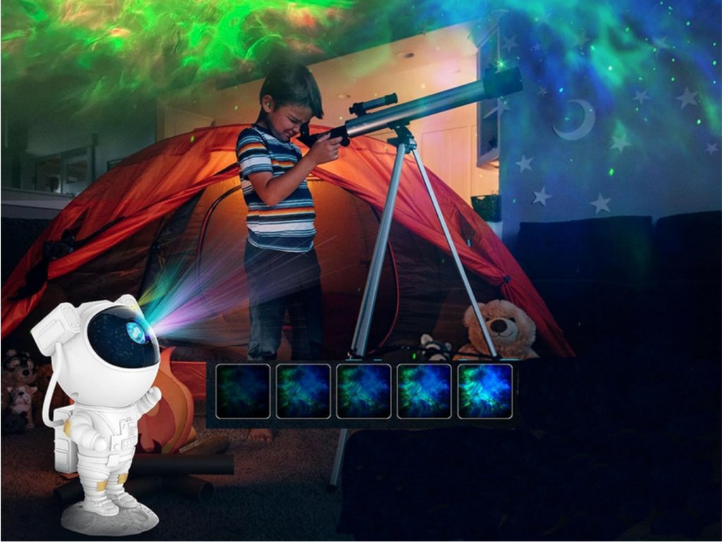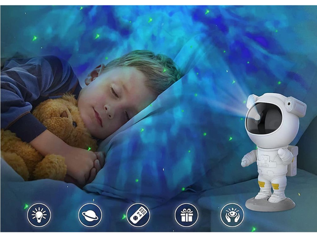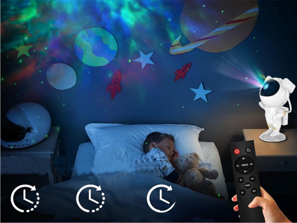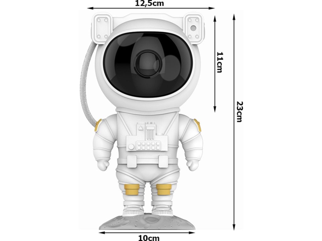 Projektor v tvare milého kozmonauta je ideálnou voľbou pre tých, ktorí chcú pridať do svojho interiéru čaro a vtipný prvok. Kozmonautova helma je magneticky pripevnená k telu, čo umožňuje plynule nastaviť uhol hviezd a hmloviny. Kozmonaut je umiestnený na mesačnom stojane, ktorý možno ľubovoľne nastaviť, a pohyblivé prvky z figúrky robia z projektora skvelú hračku aj dekoráciu. Sada je vybavená diaľkovým ovládaním pre pohodlné ovládanie zariadenia. Projektor kozmonauta je multifunkčný – funguje ako lampa aj projektor a poskytuje relaxačnú atmosféru s realistickou hviezdnou oblohou. Navyše s možnosťou premietať hviezdy a galaxie až v 8 režimoch a s otočnou hlavou umožňujúcou projekciu v širokej rovine je tento LED projektor v tvare kozmonauta perfektným darčekom pre deti aj dospelých.