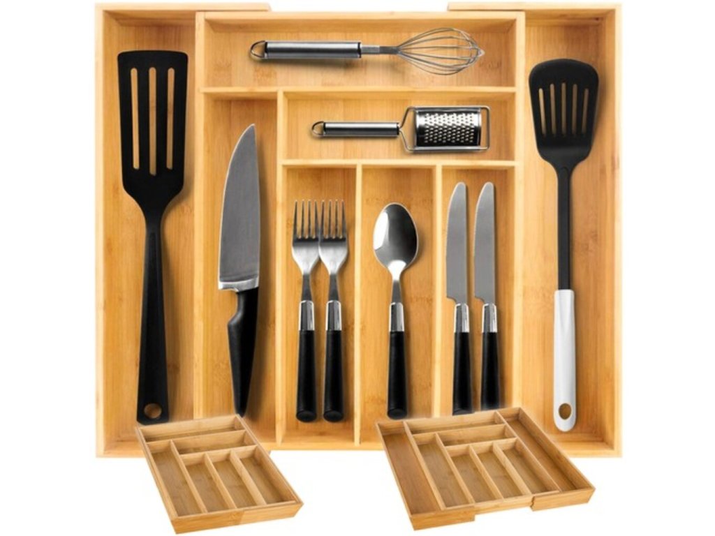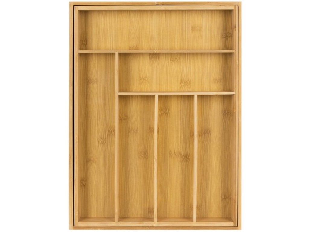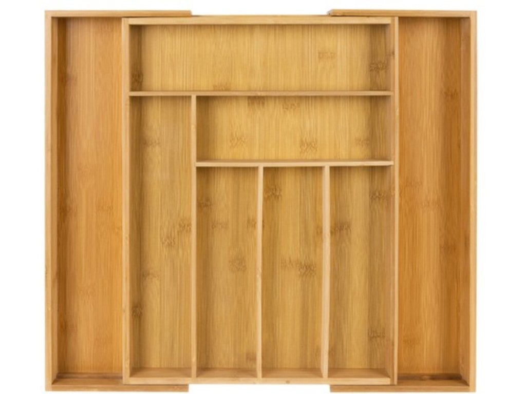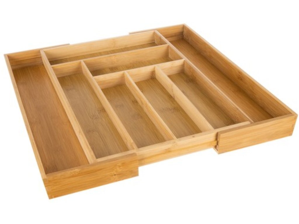 Organizér do kuchyňských zásuvek vyrobený z bambusového dřeva má jednoduchý tvar, díky kterému se hodí do moderních kuchyní. Bambusové dřevo je vhodným materiálem pro výrobu kuchyňských doplňků, protože má rychleschnoucí vlastnosti, pohlcuje nejméně bakterií a je elegantní. Proto lze takovou zásuvkovou vložku snadno umýt pod tekoucí vodou, bez obav, že dřevo nasákne vlhkost a budou se v něm rozvíjet plísně a bakterie. Častým problémem při zařizování kuchyně je udržení pořádku v drobném nábytku. Lyžice, lyžičky, nože, vidličky, naberačky, špachtle - to sú len niektoré z kuchynských potrieb, pre ktoré musíte nájsť miesto. Většinou je ukládáme do šuplíku, aby byly po ruce. V nejmenší edici má 6 přihrádek a po otevření má přihrádek 8. Díky tomu se nemusíte bát o místo pro další příbory jako jsou malé vidličky nebo přídavné nože. Organizér do zásuvky je originální dárek, který uvítá každý.