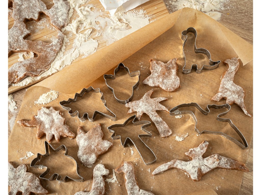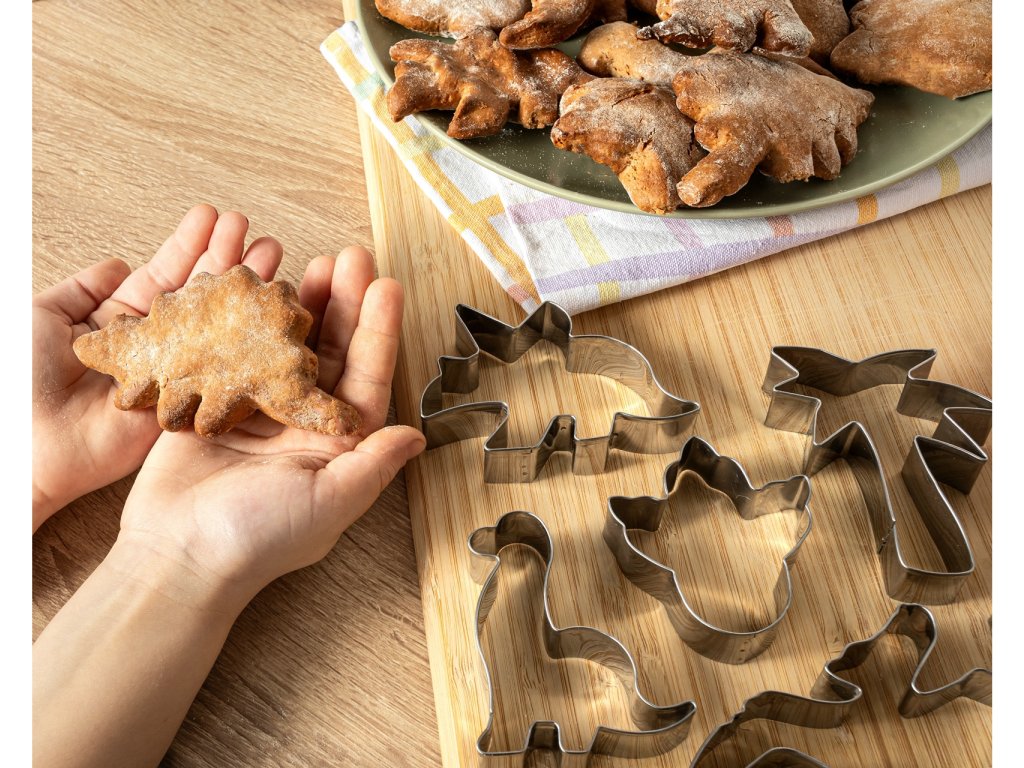Preneste sa do praveku a premeňte svoje pečenie na sladké dobrodružstvo! S touto jedinečnou sadou 6 kovových vykrajovačiek v tvare obľúbených prehistorických tvorov potešíte malých aj veľkých fanúšikov dinosaurov. Majestátny brontosaurus, roztomilý triceratops alebo dinosauří odtlačok – každý si nájde svojho favorita! Vytvorte si originálne sušienky, ktoré sa stanú hviezdou každej oslavy, rodinného stretnutia alebo len tak spríjemnia spoločné chvíle v kuchyni. S vykrajovačkami dinosauri zažijete nezabudnuteľné chvíle plné kreativity a sladkostí!