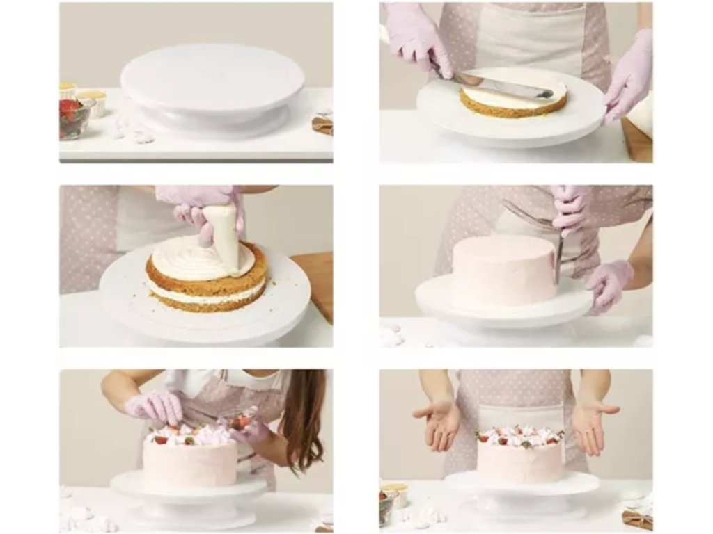 Už ste niekedy túžili ozdobiť torty najvyššou možnou úrovňou elegancie a precíznosti? S naším vysoko kvalitným stojanom na torty je to teraz možné. Tento stojan je navrhnutý tak, aby vaše pečivo vyniklo nielen vzhľadom, ale aj stabilitou a bezpečnosťou. Jeho otáčavý tanier umožňuje jednoduché zdobenie torty zo všetkých strán, zatiaľ čo odnímateľná základňa uľahčuje jeho údržbu. Stojan na torty nie je len praktický, ale aj elegantný doplnok do vašej kuchyne. Jeho transport je jednoduchý vďaka nohe a otáčavému mechanizmu. Navyše k nemu patria tri rôzne ozdobné špachtle, ktoré pomôžu vytvoriť jedinečné vzory na vašich dezertoch. Nebuďte obmedzení tradičnými spôsobmi servírovania, dajte svojim tortám tú najlepšiu prezentáciu s naším stojanom na torty. S ním bude vaše sladké kulinárske dielo dosahovať nové výšky elegancie a kvality. Buďte hrdí na svoje dezerty a urobte z nich skutočné umelecké dielo s naším stojanom na torty.