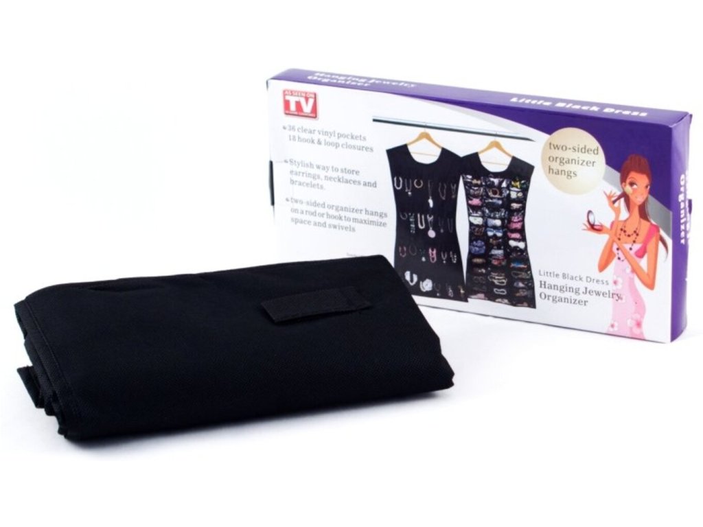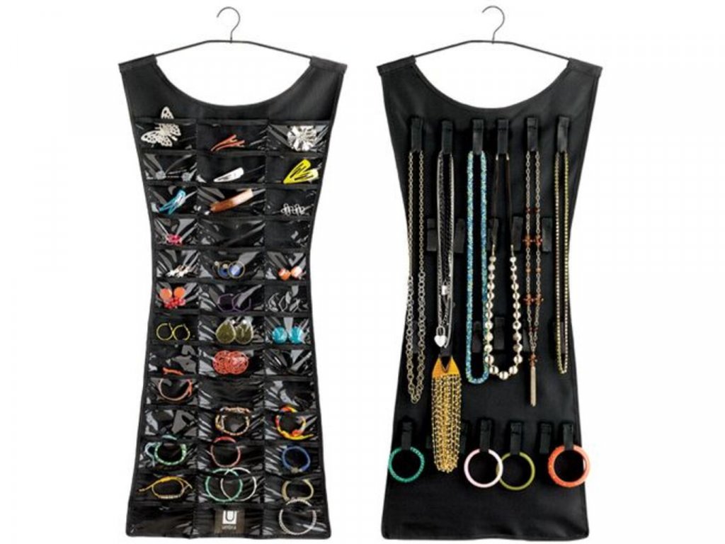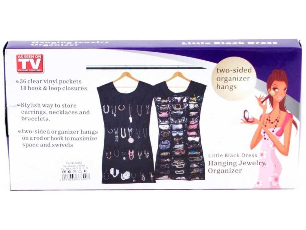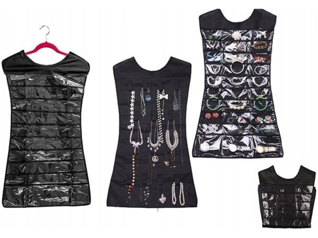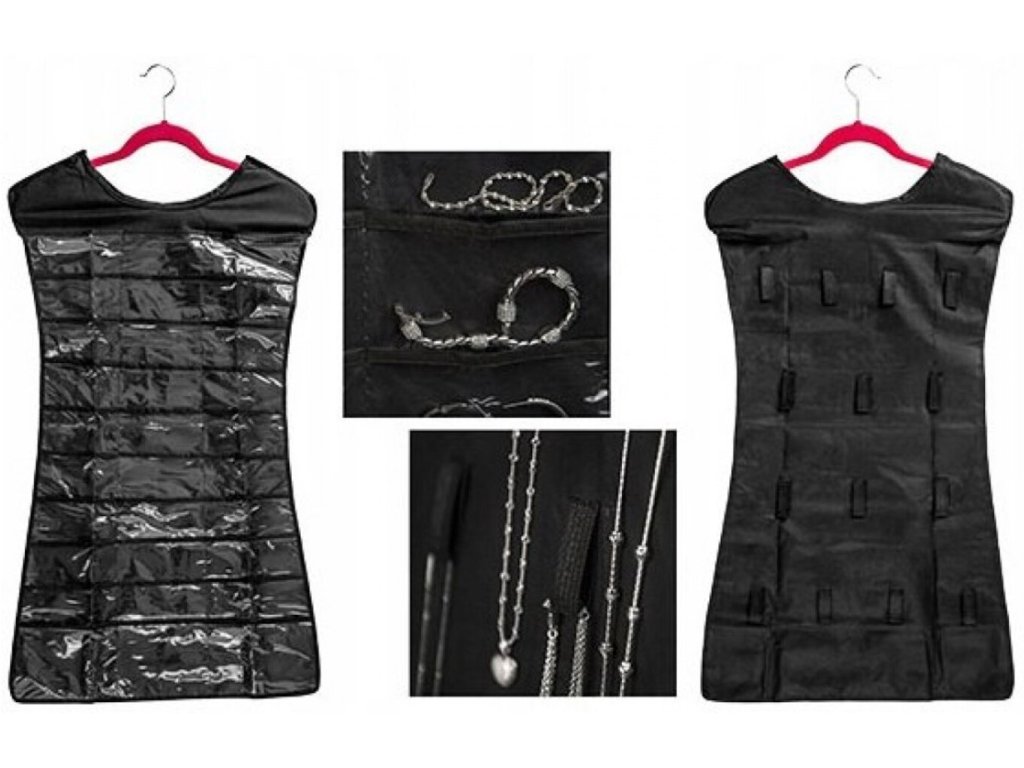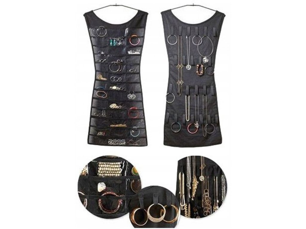 Ženy a šperky jednoducho patria k sebe. Sú neoddeliteľnou súčasťou života. Máte aj vy veľa náušníc, náhrdelníkov, náramkov, brošní, spôn a iných ozdôb? Už Vás nebaví, že sa Vám Vaše drahocenné šperky strácajú, povaľujú sa po stole, alebo sa Vám všetky dokopy zamotajú? Máme pre Vás originálne riešenie v podobe skvelého organizéra na šperky. Elegantný organizér s dizajnom šiat obsahuje veľa pútok a vreciek, kam si môžete uschovať Vaše náramky, retiazky a prstienky. Všetko bude prehľadné a nič sa Vám nestratí. Každá žena i dievča by túto praktickú pomôcku určite ocenila. Organizér na šperky je originálny darček pre ženy akéhokoľvek veku.