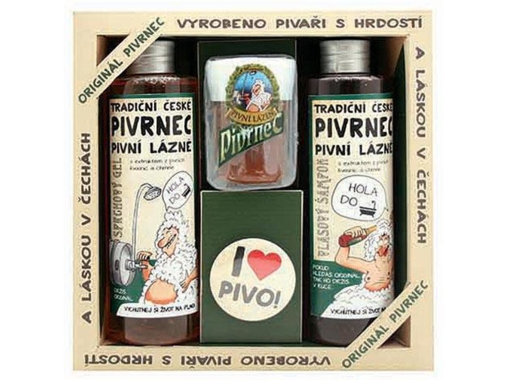 Pivná kozmetika Pivrnec, darčekové balenie kozmetiky s výťažkami z pivných kvasníc a chmeľu. Obrázky na etiketách kozmetiky vytvoril známy karikaturista Petr Urban. Kozmetická súprava je skvelým voňavým darčekom nielen pre mužov.