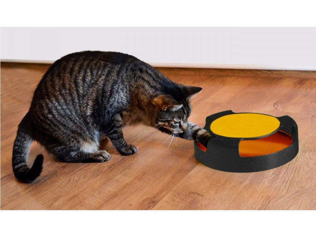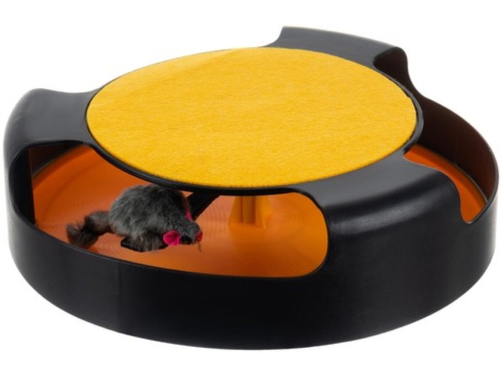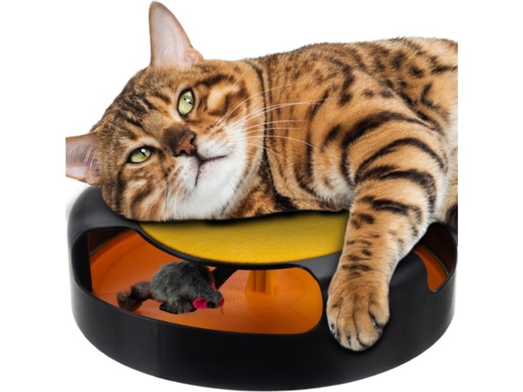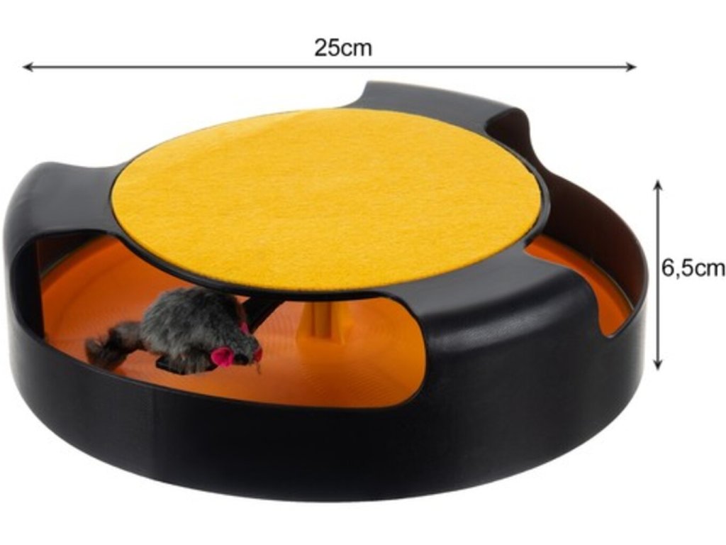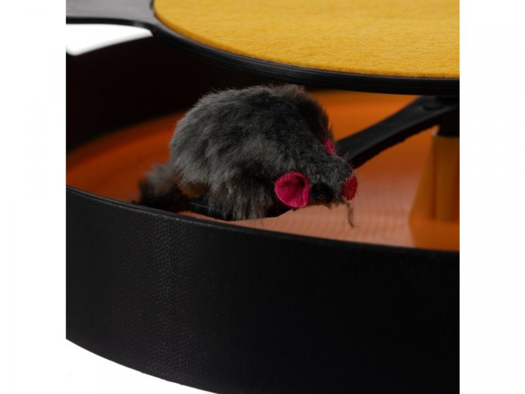 Mačky sa rady hrajú a robia neplechu. Hračka pre domáce mačky v podobe točiacej sa myši je skvelou alternatívou k lovu vo voľnej prírode. Nadýchaného člena rodiny to určite zaujme a dlho sa s ním nebude nudiť. Hračka je vhodná pre všetky domáce mačky bez ohľadu na ich vek, pohlavie a veľkosť. Drobné mačiatka môžu sedieť na hornej podložke. Je okrúhleho tvaru a má 3 otvory. Otvory sú dostatočne veľké, aby sa do nich zmestili mačacie nohy akejkoľvek veľkosti. Vnútri je napodobenina myši, ktorá sa po údere labkou uvedie do pohybu a otáča sa po obvode kruhu, čím povzbudzuje mačku, aby pokračovala v hre. Zospodu protišmykové podložky. Výhodou výrobku je, že zároveň slúži ako škrabadlo. V hornej časti je podložka, ktorá slúži na otieranie pazúrov a zabraňuje poškodeniu nábytku a vybaveniu domova či bytu. Hračka dokonale spĺňa prirodzené potreby loveckého inštinktu a podporuje fyzickú aktivitu, ktorá ovplyvňuje celkový zdravotný stav zvieraťa a robí mačku pokojnejšou. Dôležitou a praktickou vlastnosťou produktu je, že sa domáce zviera môže hrať samostatne, bez zapojenia členov domácnosti, a tiež úplne bez majiteľov. Hračka je ideálna pre domáce použitie, rovnako ako vybavenie pre útulky alebo väčšie koterce pre mačky.