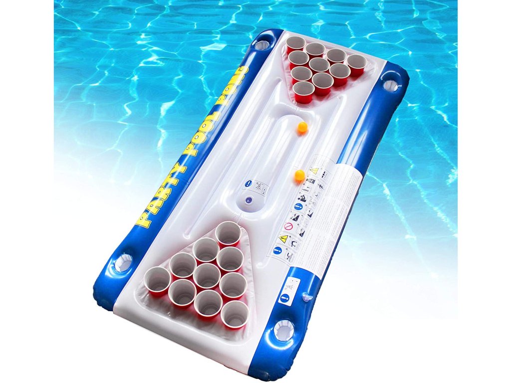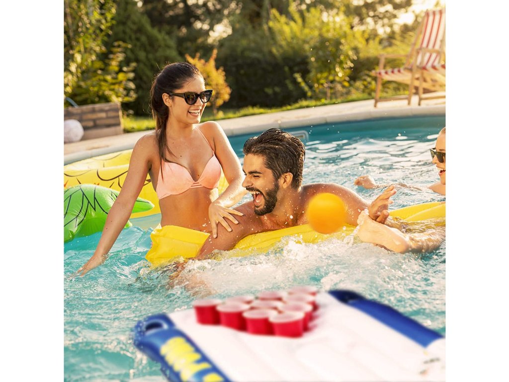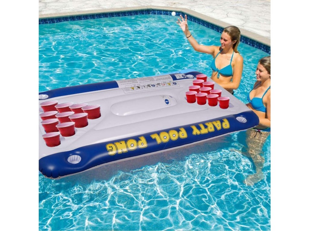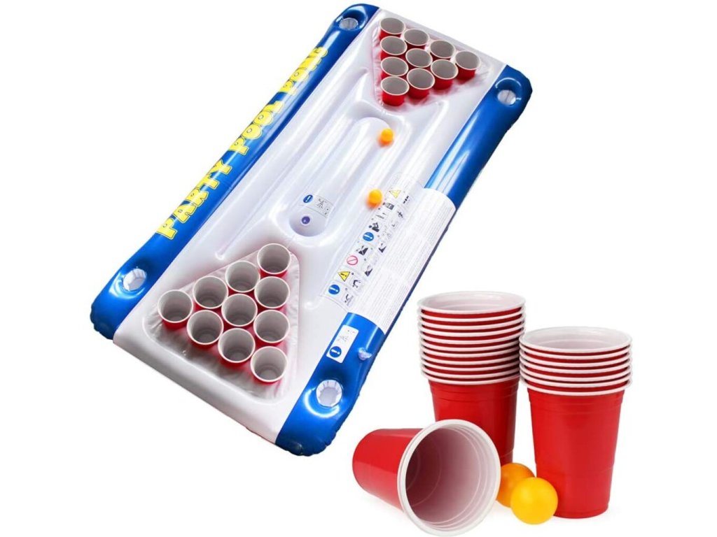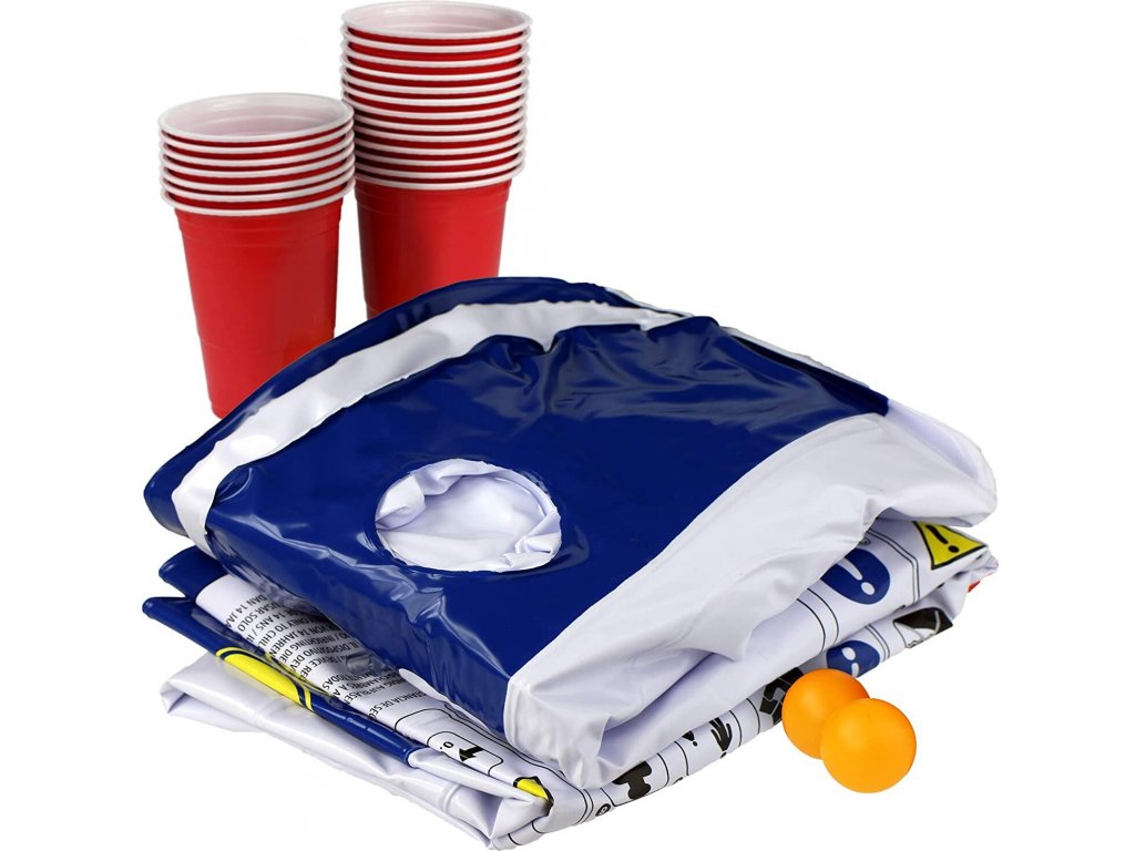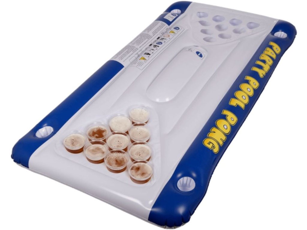 Beer pong nafukovací bazén matrac je ideálnym darčekom pre každého, kto sa rád zabáva a miluje pivo. Beer pong neboli pivní ping ponk zná většina lidí z amerických filmů. Beer pong je hra pro čtyři hráče, která je spojená s pitím piva. Je to perfektní zábava na každou letní párty. Úkolem hráčů je hodit pingpongový míček do soupeřových kelímků s pivem. Trefený kelímek musí soupeř vypít. Kelímky můžete naplnit jakýmkoliv pitím např. limonádou a může to být i zábava na dětskou párty. Beer pong je oblíbená hra na párty u bazénu. Nebylo by tedy lepší, kdyby existoval způsob, jak hrát tuto zábavnou pitnou hru ve vodě? Tento bazénový pivní pongový stůl je nafukovací ve tvaru pivního pongového stolu. Na obou koncích má držáky nápojů, takže hru mohou hrát dvě hry. Držáky na poháry mají univerzální velikost a hodí se pro většinu sklenic a pohárů na pivo.
