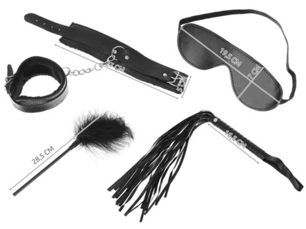 - Putá, roubík a golier sú nastaviteľné. Šatka na gumičku. Bič je vyrobený z mäkkej kože. Svorky s ozdobnými zvonmi. Sada má tiež konektor pre putá a vodítko.