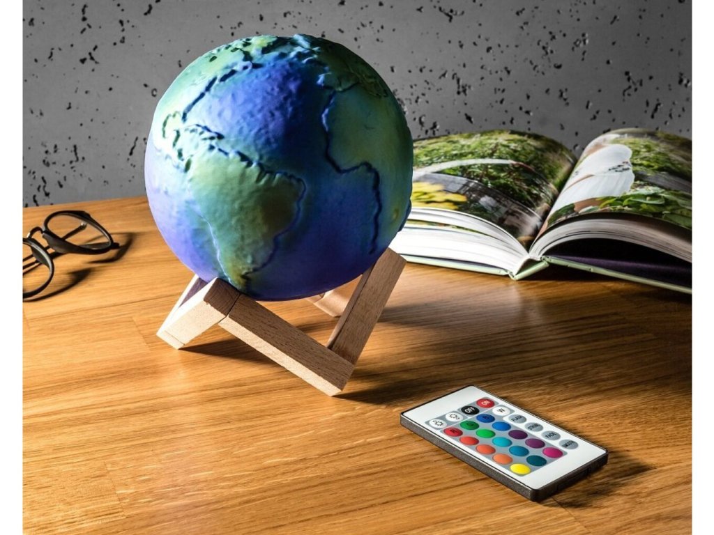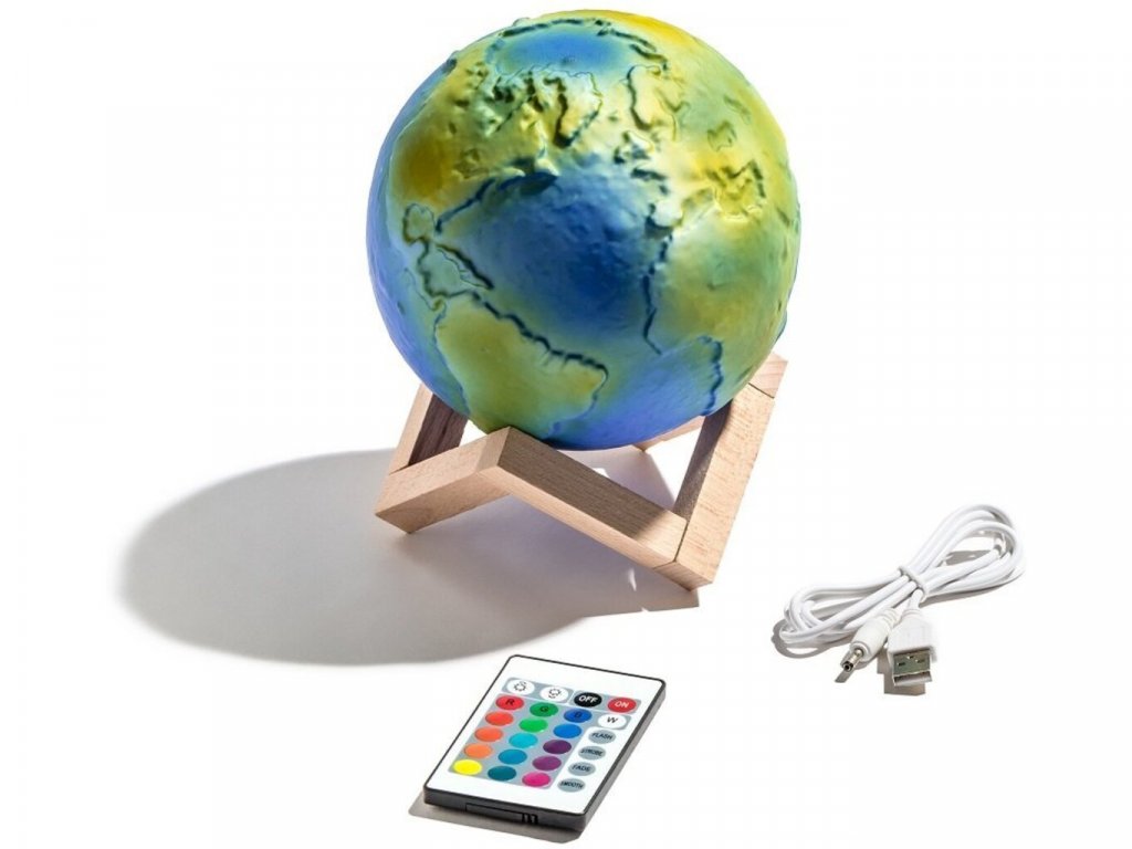 3D lampa Zemeguľa je krásnym trojrozmerným znázornením povrchu našej úžasnej planéty, ktorú možno obdivovať až v 16 farbách. Lampa tiež pripomína osvetlenú guľu a vyzerá štýlovo prakticky v akomkoľvek interiéri, a to ako počas dňa, tak s osvetlením po zotmení. Farby možno meniť pomocou diaľkového ovládača alebo dotykom, stačí pripojiť lampu na zdroj napájania pomocou priloženého kábla USB, nabiť ju, umiestniť na štýlový drevený stojan a potom si niekoľko hodín užívať krásne svetlo našej nadpozemskej lampy.