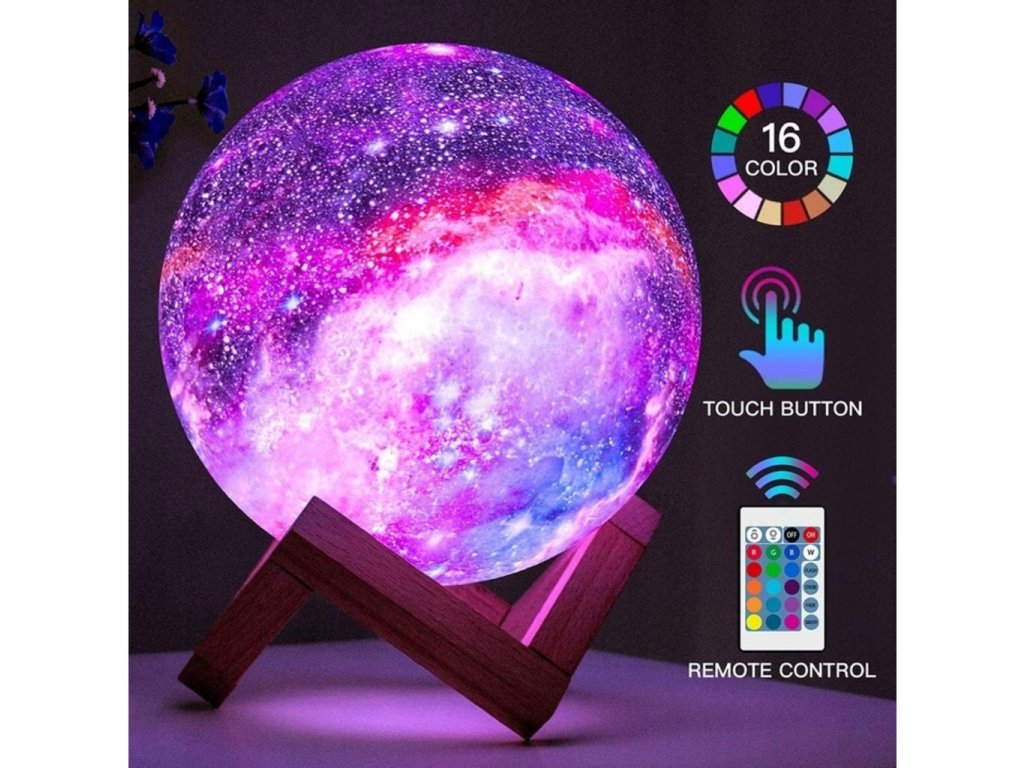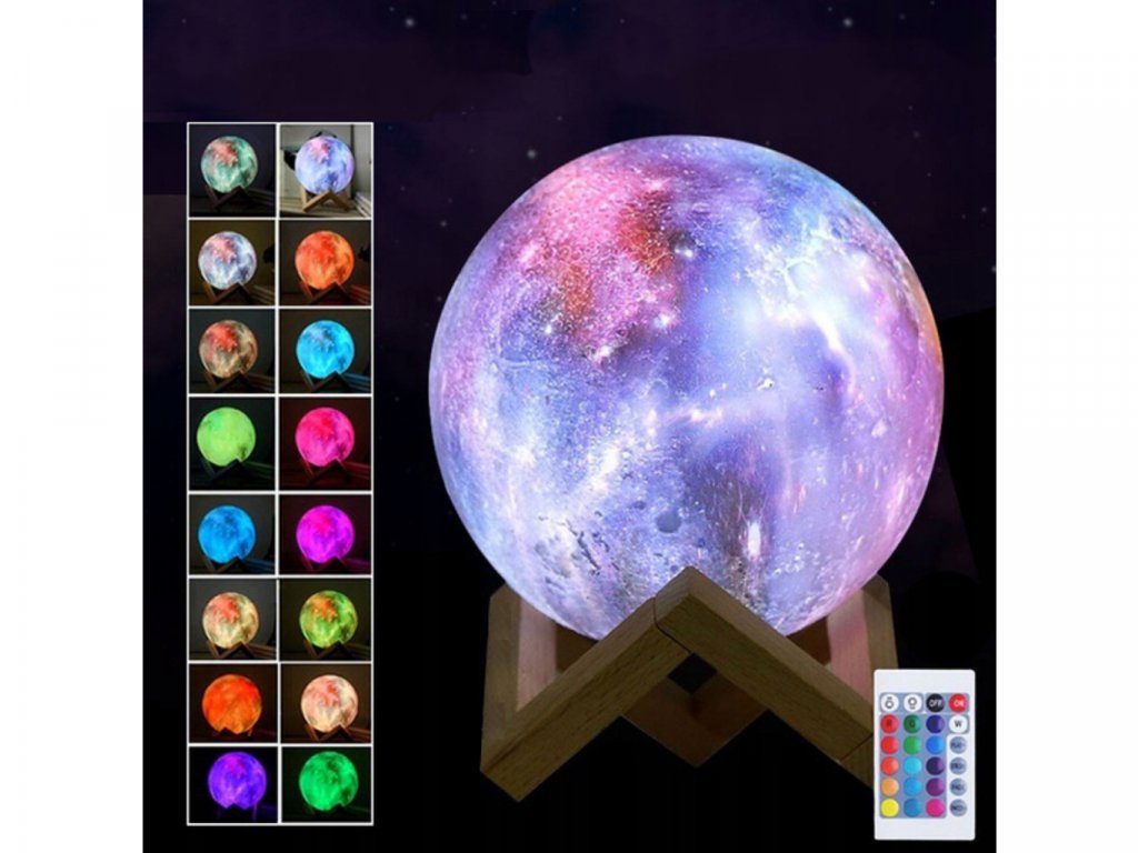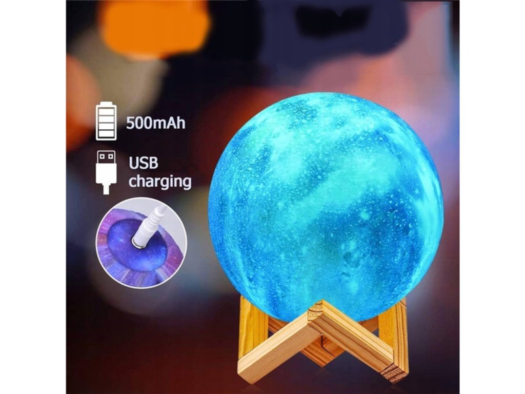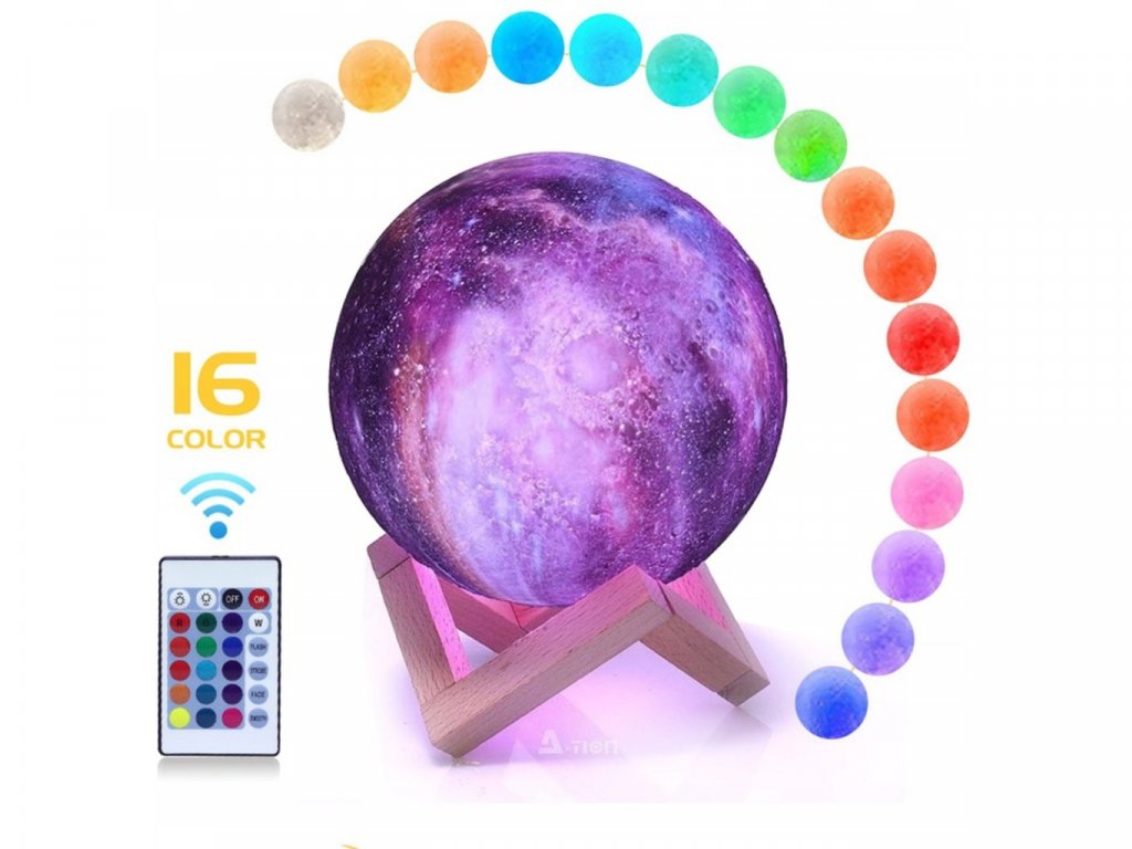 Lampička farebný Mesiac 15cm, 16 farieb bola vyrobená s využitím inovatívnej technológie 3D tlače, vďaka ktorej dokonale napodobňuje náš mesiac. Má hrubú štruktúru a každý kráter na ňom zodpovedá tomu skutočnému. Ak snívate o zaspaní pod jasným, žiariacim mesiacom, táto lampa vám dáva takú príležitosť. Má 16 farieb svetla, 4 režimy, počas ktorých ich lampa automaticky mení a 4 rôzne úrovne jasu. Režimy je možné voliť pomocou praktického diaľkového ovládača alebo dotykom na spodnú časť lampy. Lampa je navyše napájaná cez USB kábel, takže nabíjanie je pohodlné a nie je potrebné batériu vymieňať. (doba nabíjania približne 3 hodiny). Táto dizajnová lampa je ideálna do každého interiéru. Bude to vyzerať pôsobivo v detskej izbe, spálni alebo v obývacej izbe. Môžete ju dať večer na nočný stolík alebo na poličku nad ním, a keď svieti, v miestnosti prevládne jedinečná atmosféra. Imitácia mesiaca bola vyrobená z ekologického materiálu bez zápachu, ktorým je polyaktíd. Je plne biologicky rozložiteľný. Získava sa z obnoviteľných surovín, ako je kukuričná múčka. Nemá nepriaznivý vplyv na zdravie a jeho svetlo a intenzitu je možné upraviť podľa vašich predstáv. Z tohto dôvodu je tiež skvelý pre izbu najmladších obyvateľov domácnosti.
