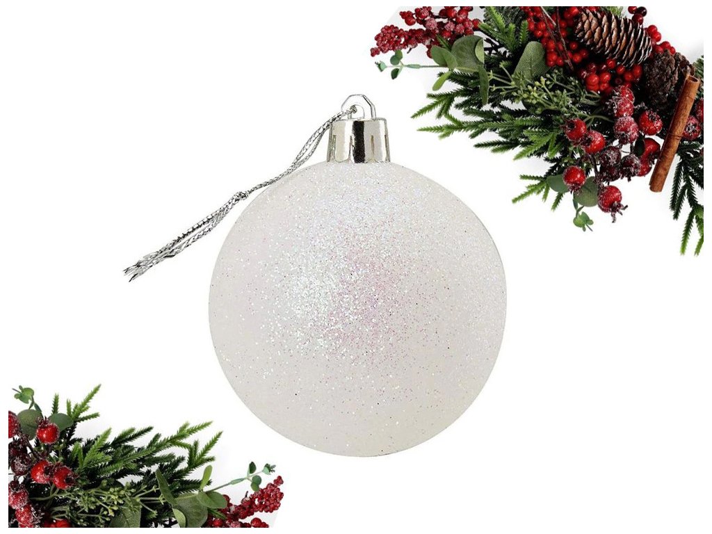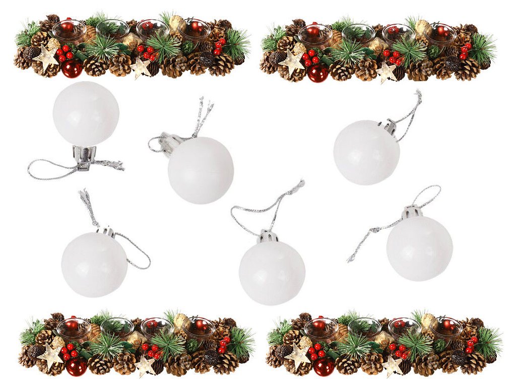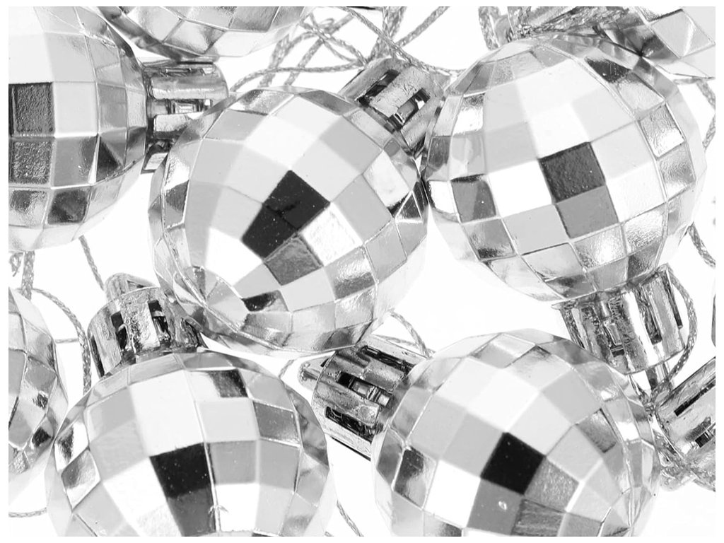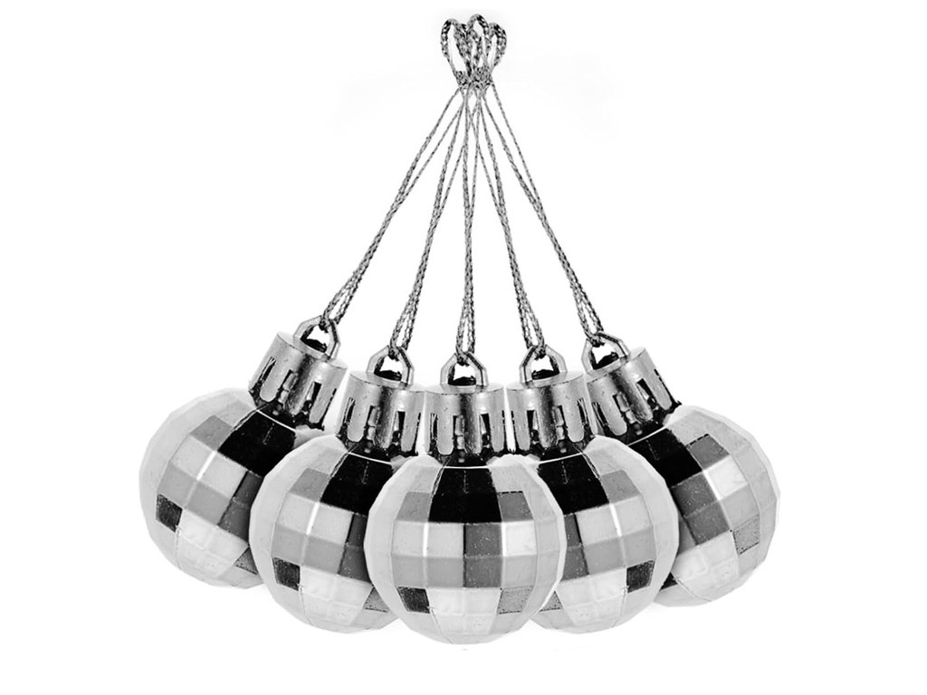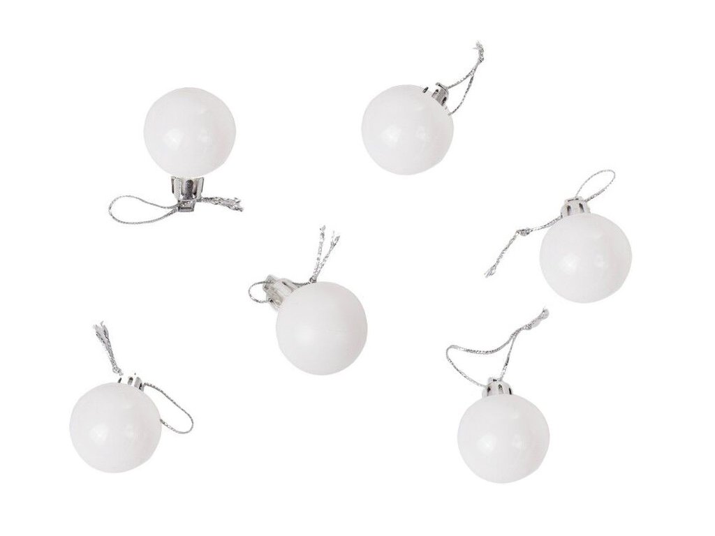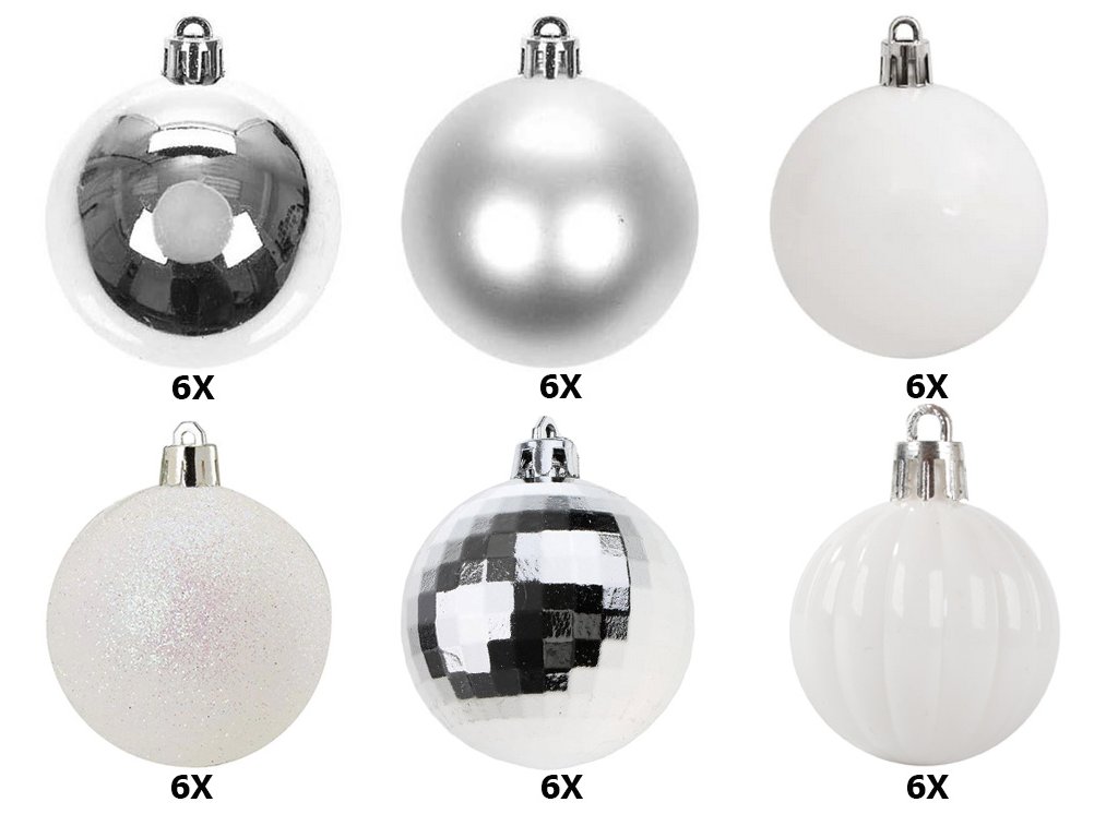 - 36 ks (6x biela so vzorom, 6x biela hladká, 6x biela s brokátom, 6x strieborná matná, 6x strieborná lesklá, 6x strieborná disko guľa)