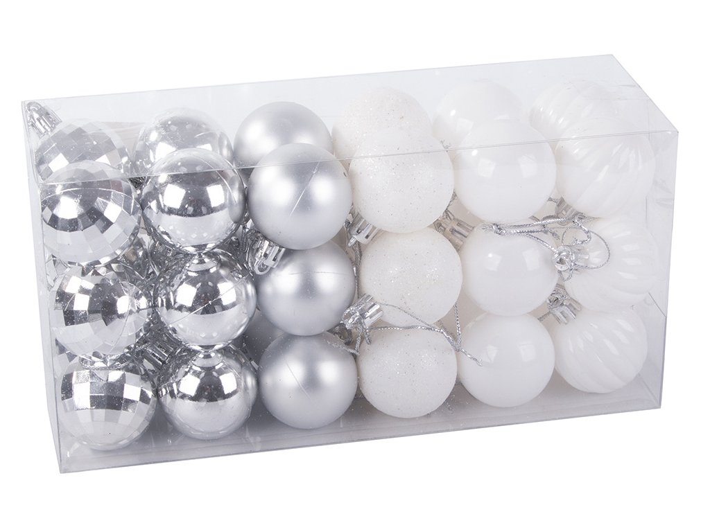 Sada vianočných ozdôb 36 ks - Sada baniek 3cm je ideálnym doplnkom pre každú vianočnú výzdobu. Táto sada obsahuje 36 krásnych plastových baniek v rôznych vzoroch, ktoré dodajú vášmu vianočnému stromčeku alebo dekoráciám jedinečný kúzelný vzhľad. Sada obsahuje ako hladké, tak trblietavé, matné a lesklé kúsky v elegantných strieborných a bielych odtieňoch, ktoré sa budú skvele vynímať na každom vianočnom stromčeku.